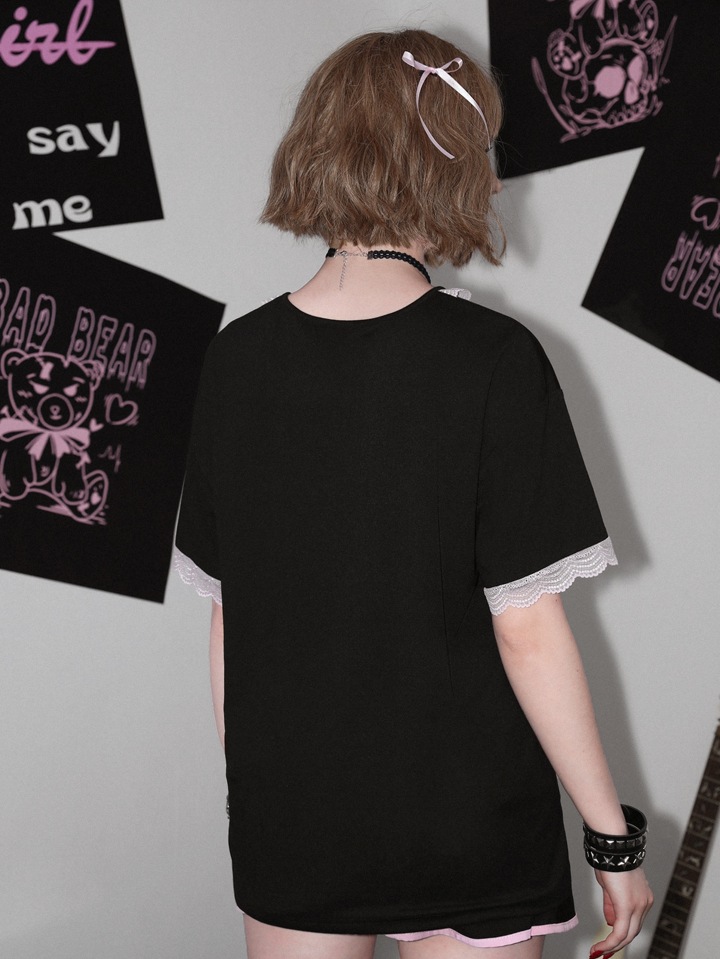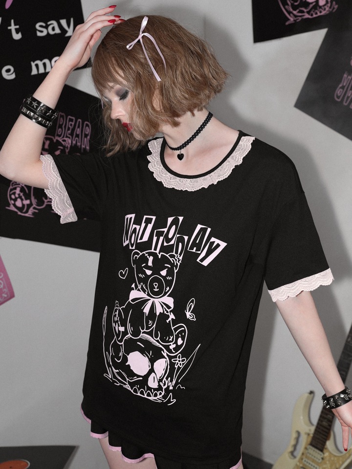 Sweetness Cartoon Bear Print Lace Trim Tee