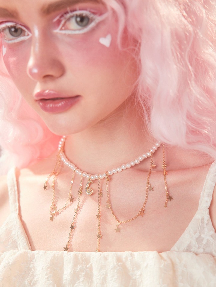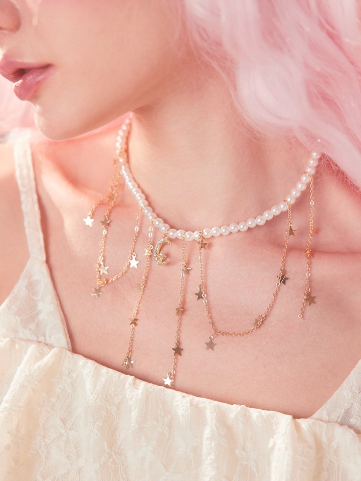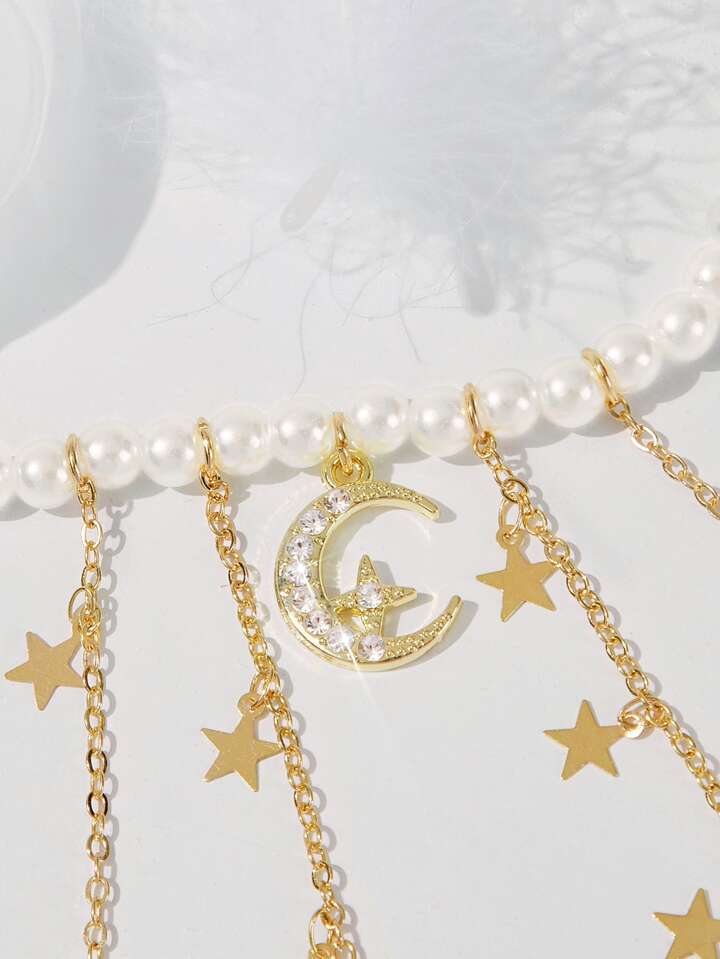 Sweetness Faux Pearl Decor Moon & Star Charm Beaded Necklace