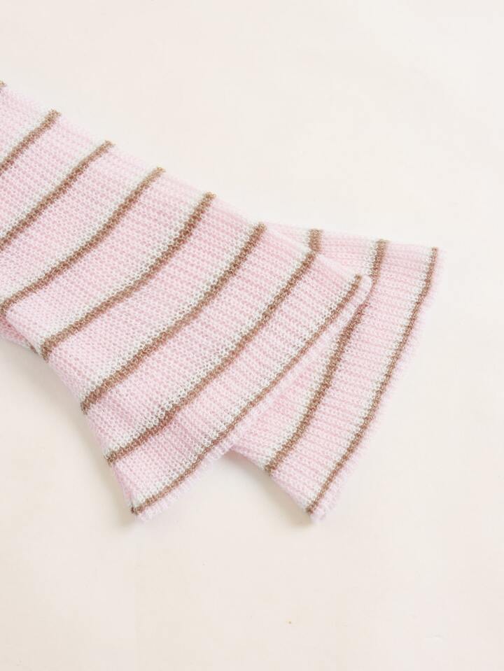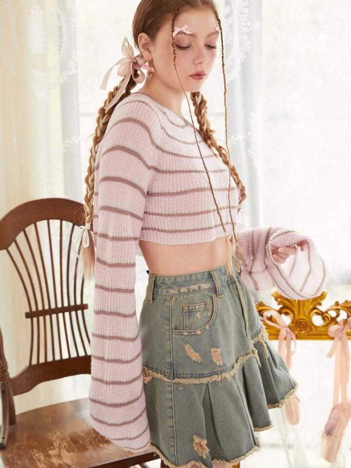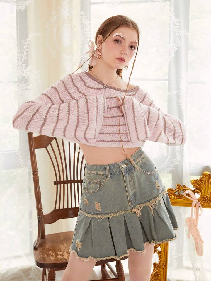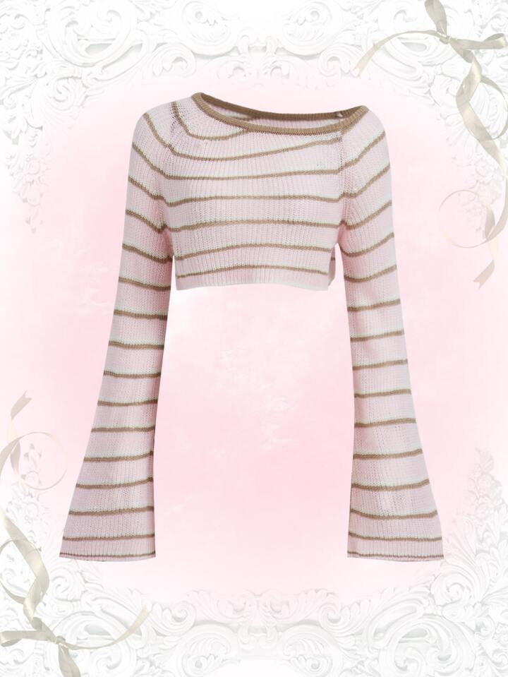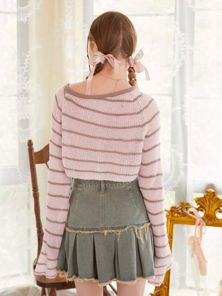 Sweetness Striped Pattern Asymmetrical Neck Flounce Sleeve Crop Sweater