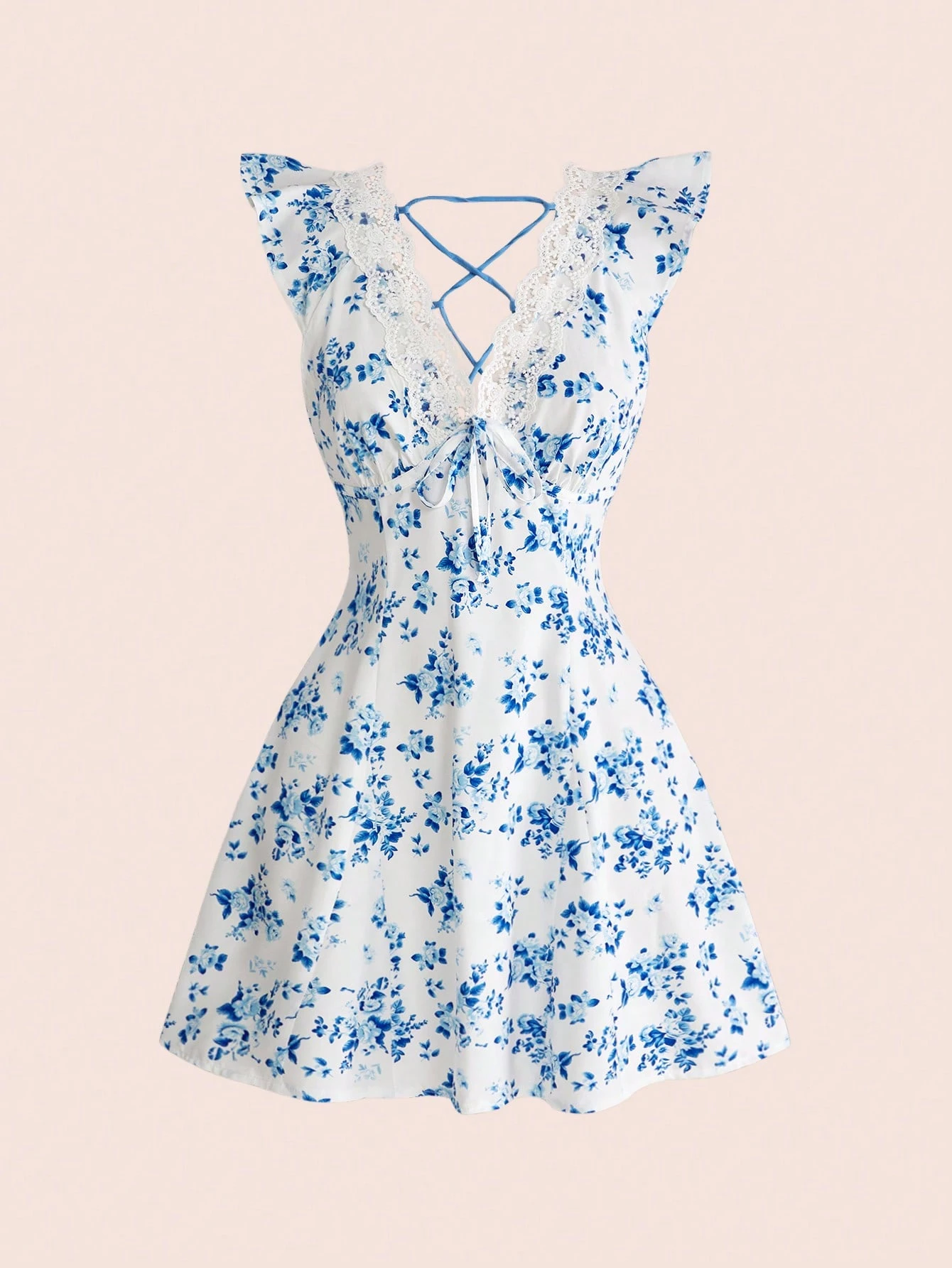 Sweetness Sweet Vacation Girl Style Blue Floral Print White Background Mini Dress