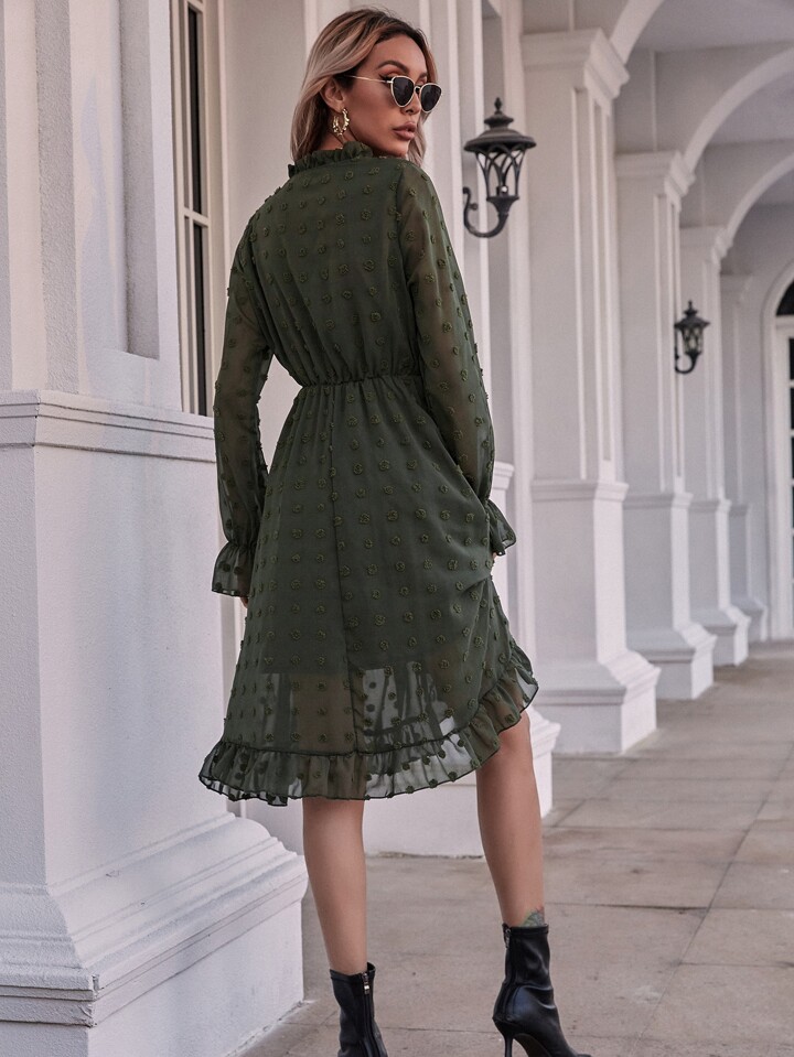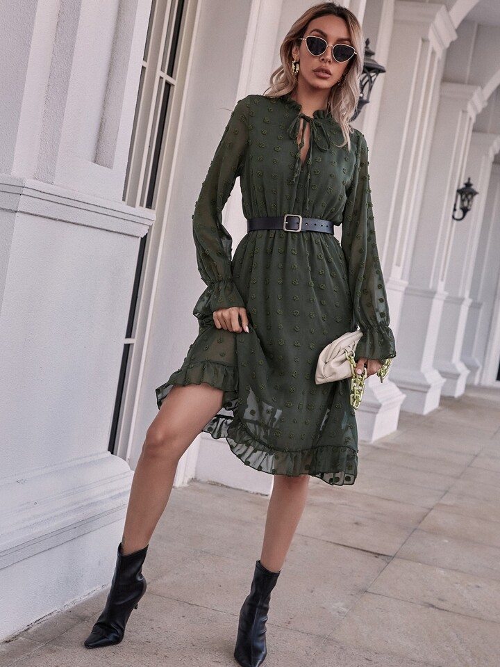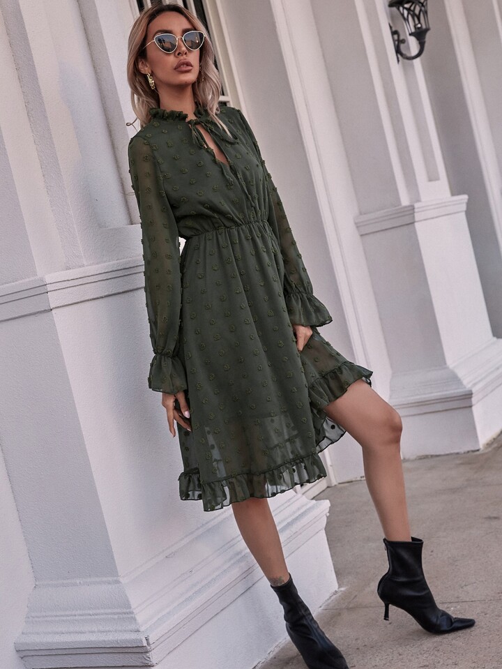 Swiss Dot Chiffon Tie Neck Flounce Sleeve Dress