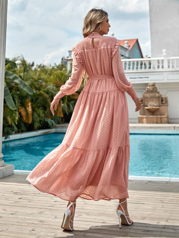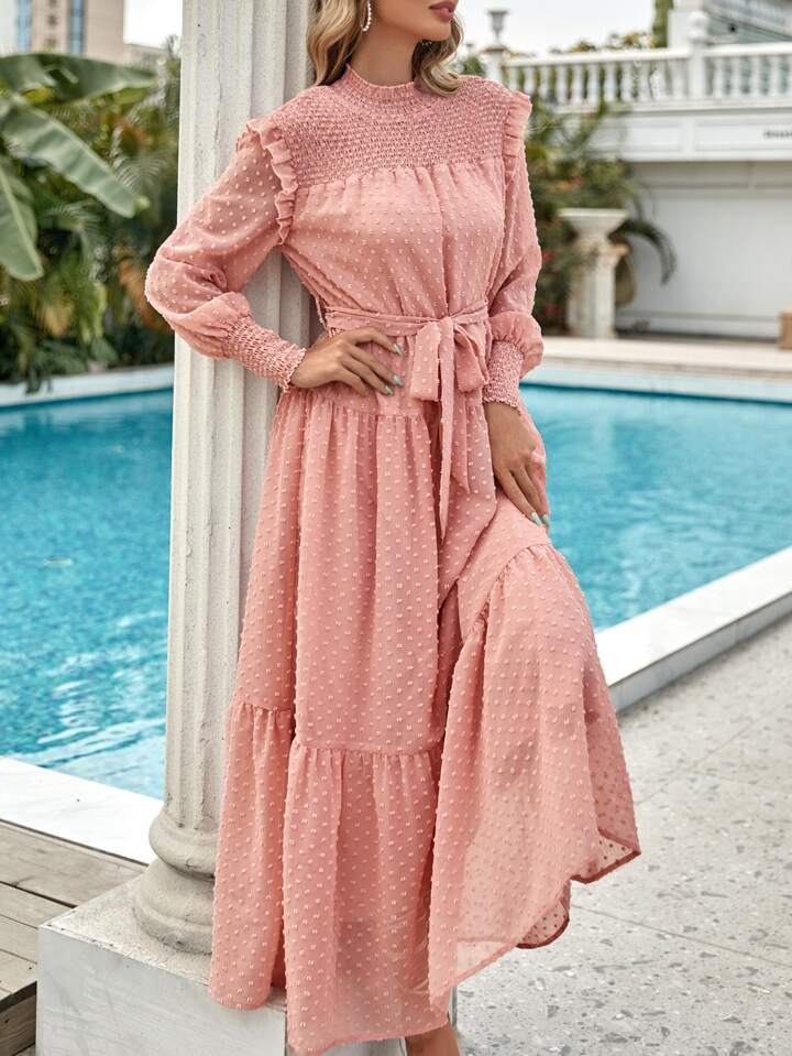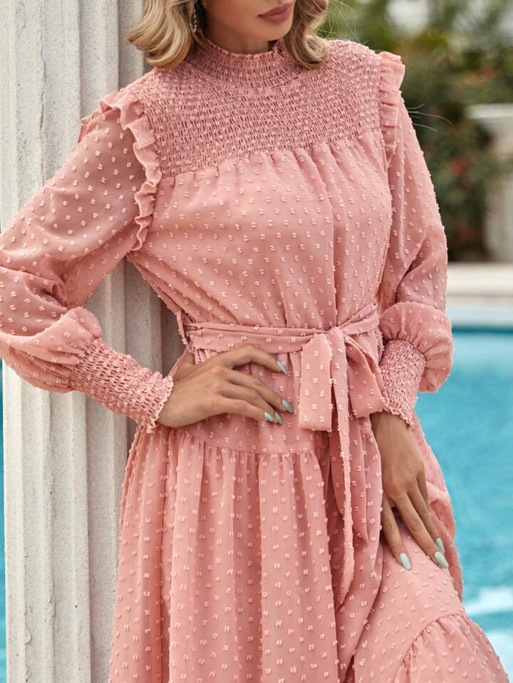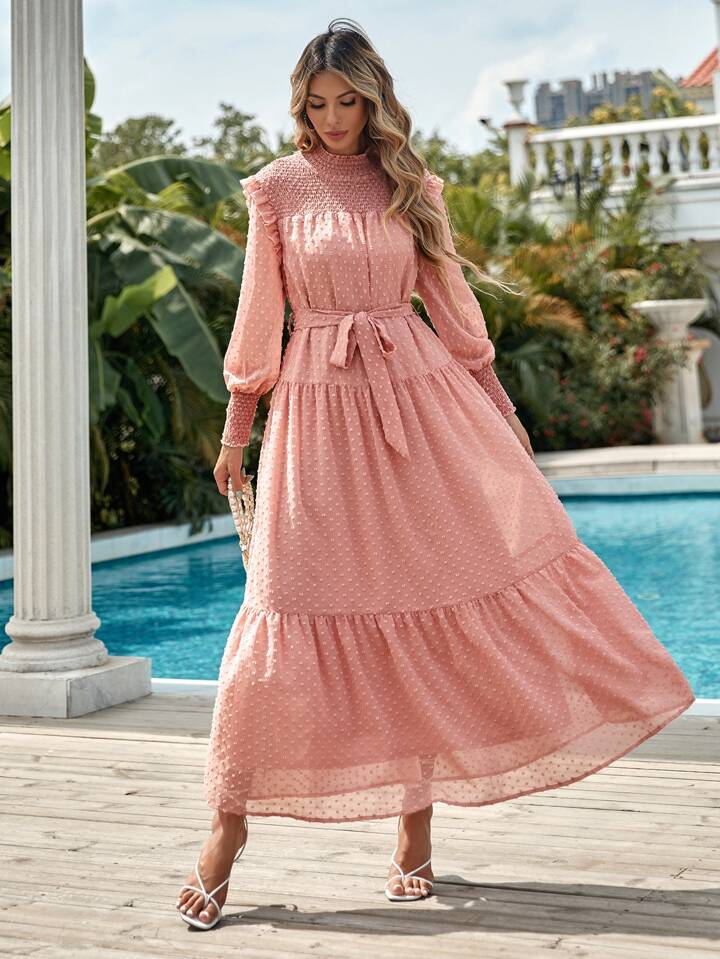 Swiss Dot Shirred Yoke Belted Ruffle Hem Dress