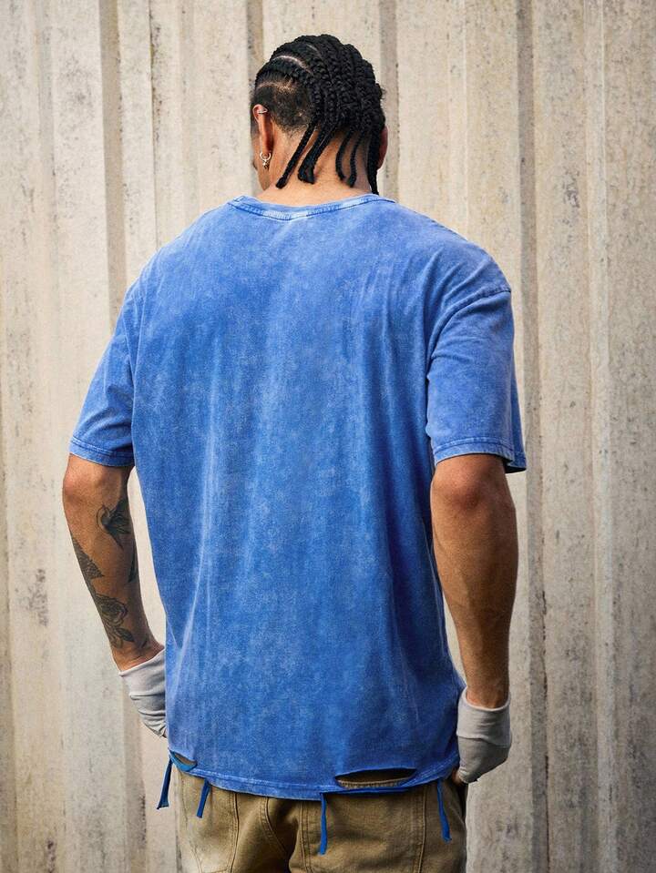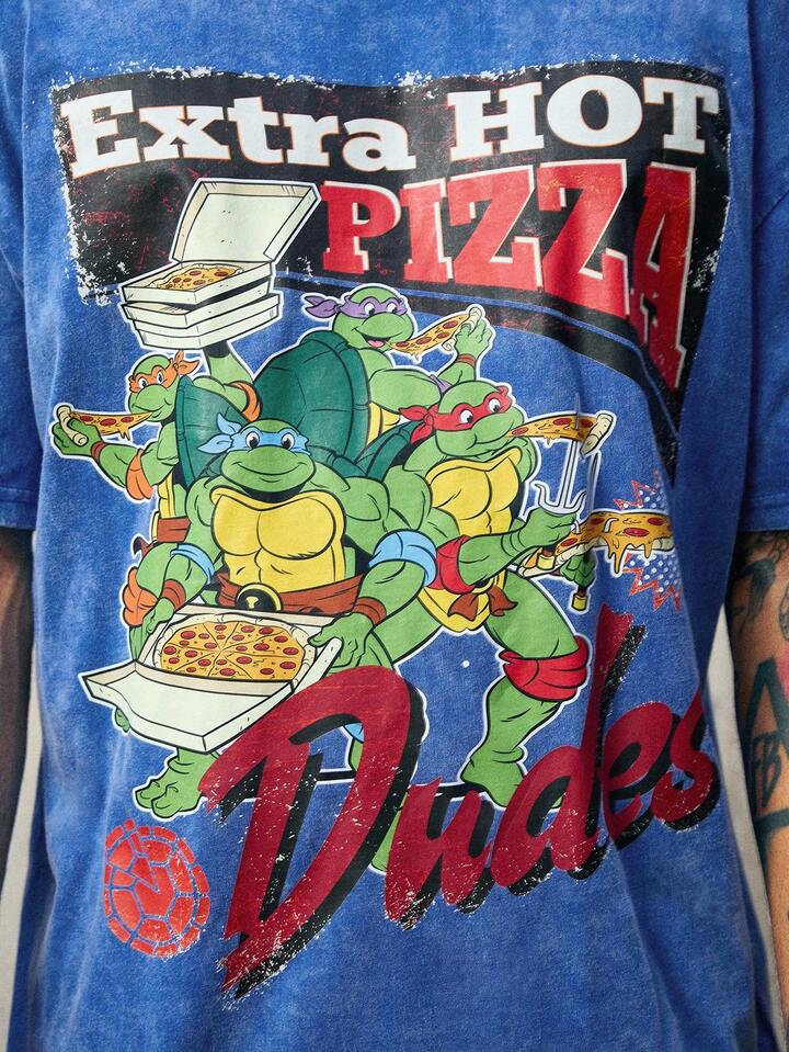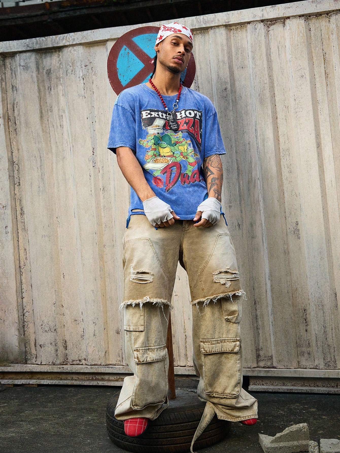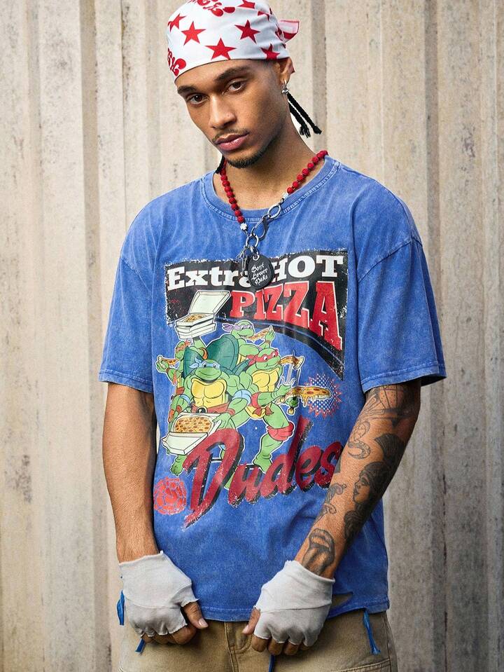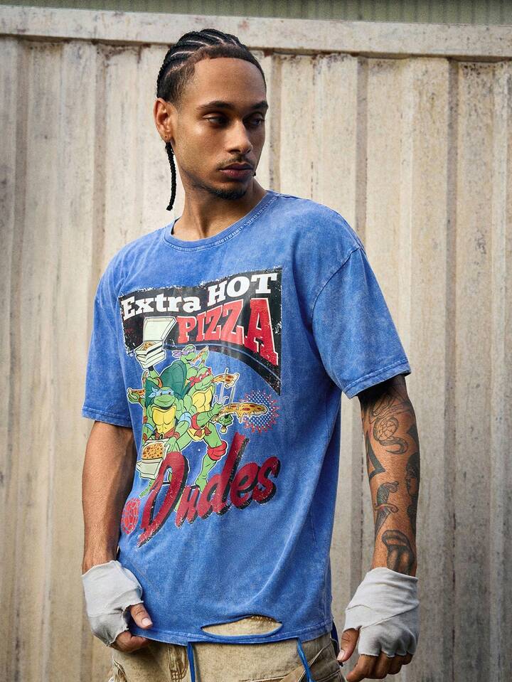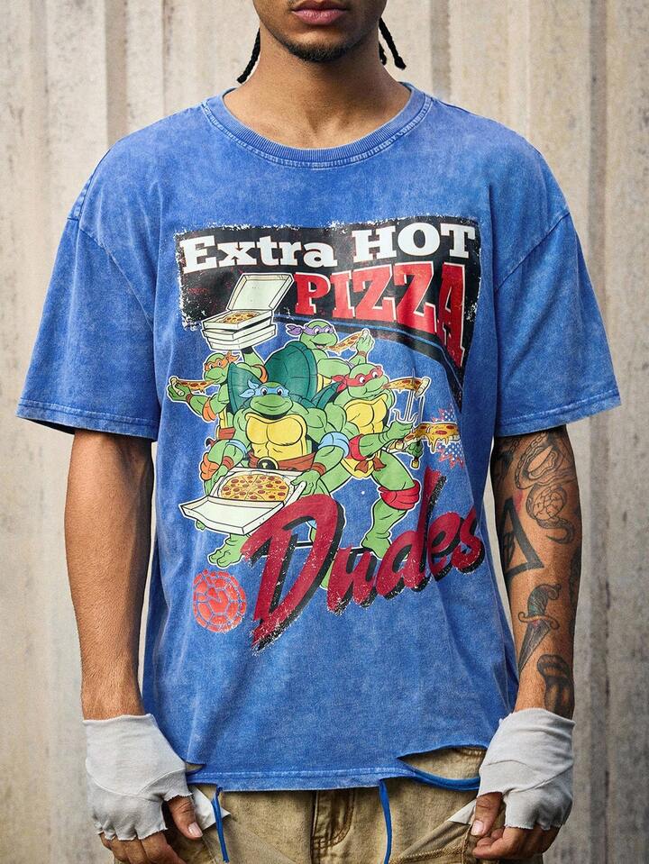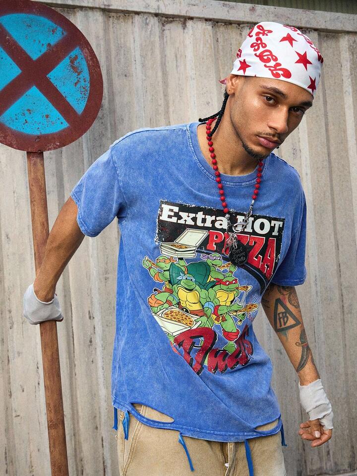 TEENAGE MUTANT NINJA TURTLES X ROMWE Men's Fashionable Street Cartoon Turtle, Pizza & Letter Print Washed Drop Shoulder Loose Ripped Fringe Hem T-Shirt, Summer