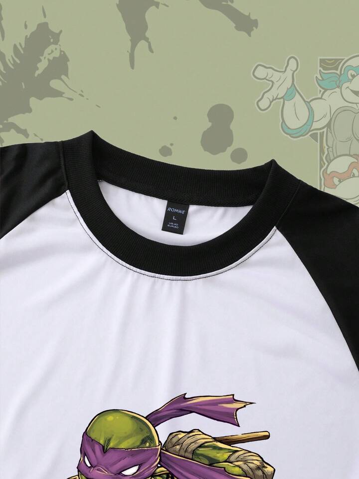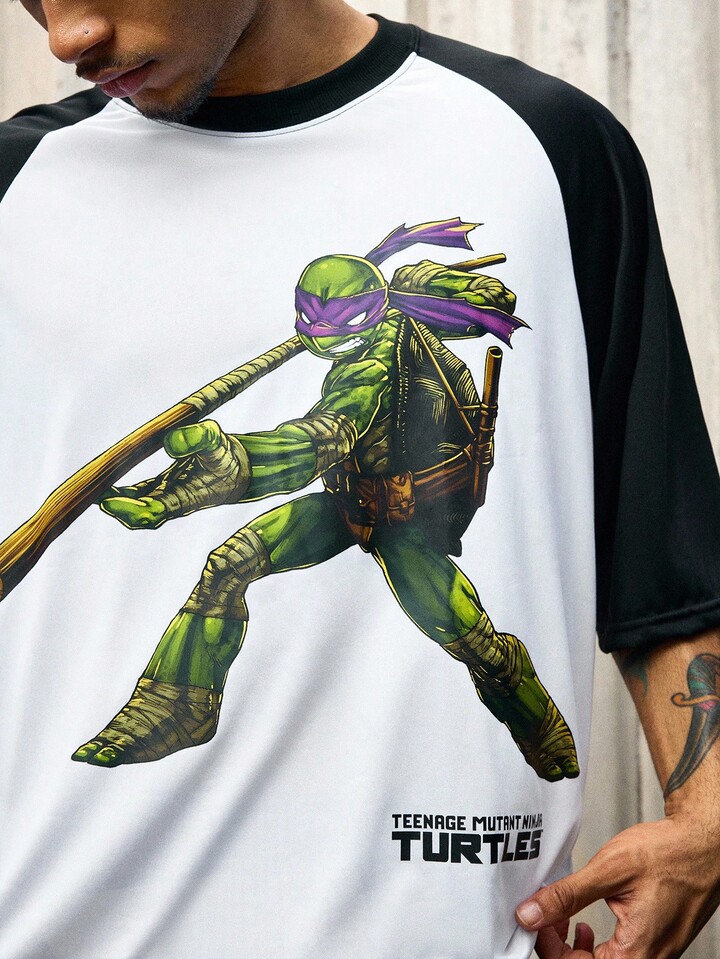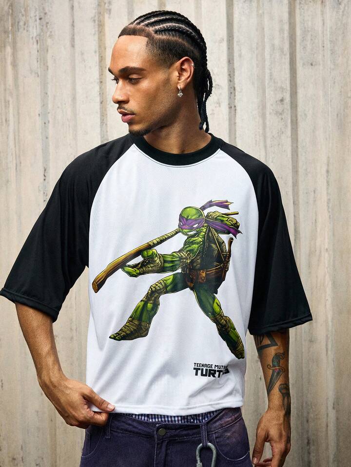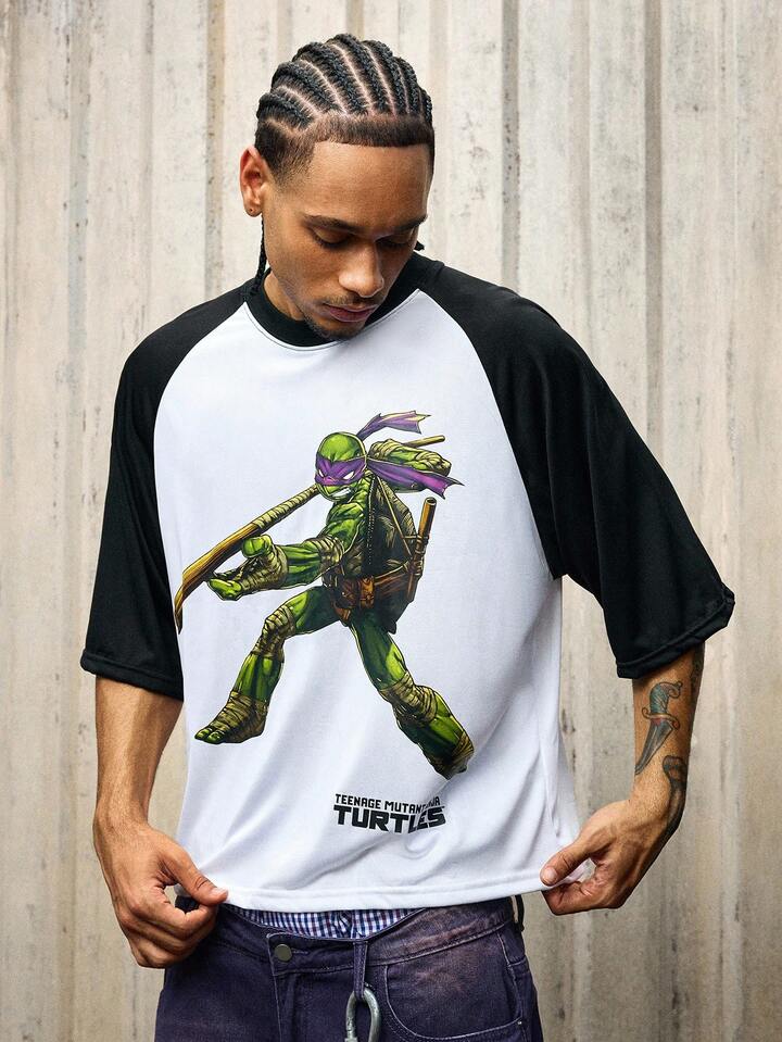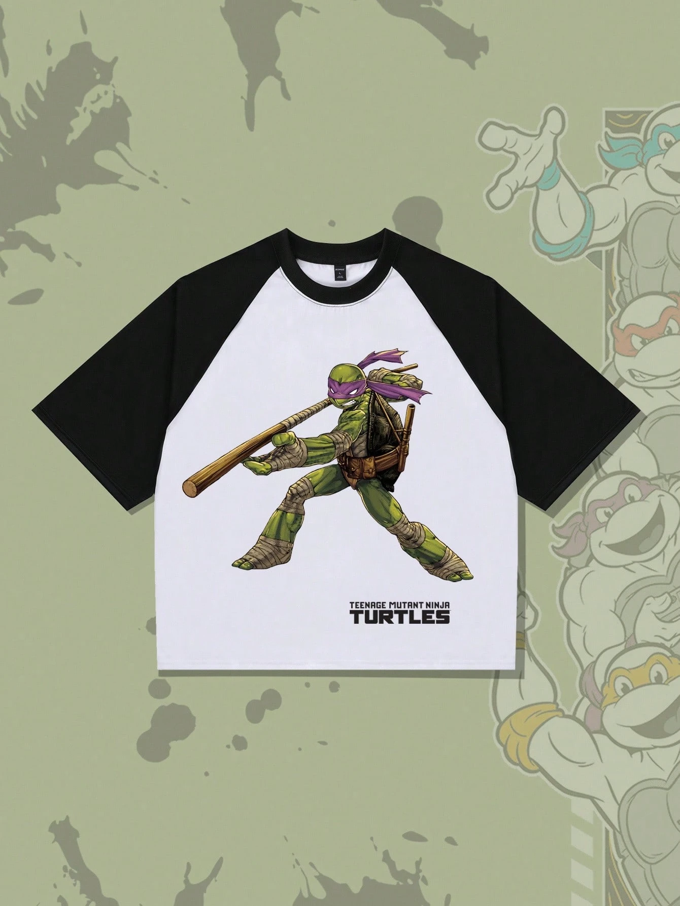 TEENAGE MUTANT NINJA TURTLES X ROMWE Men's Fashionable Street Cartoon Turtle & Slogan Graphic Contrast Raglan Sleeve Loose T-Shirt, Summer