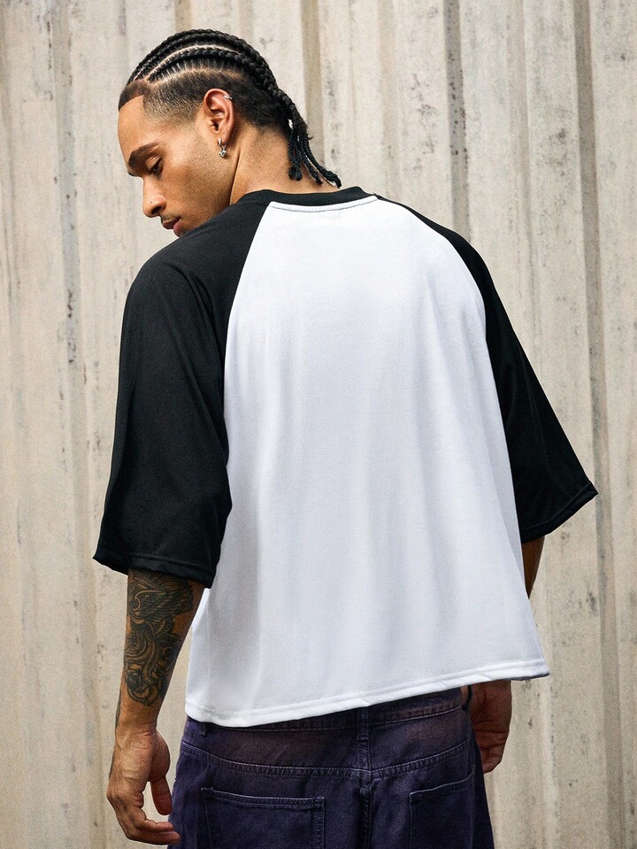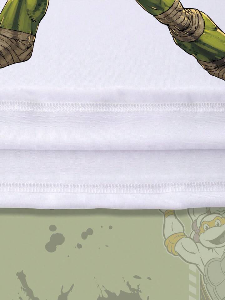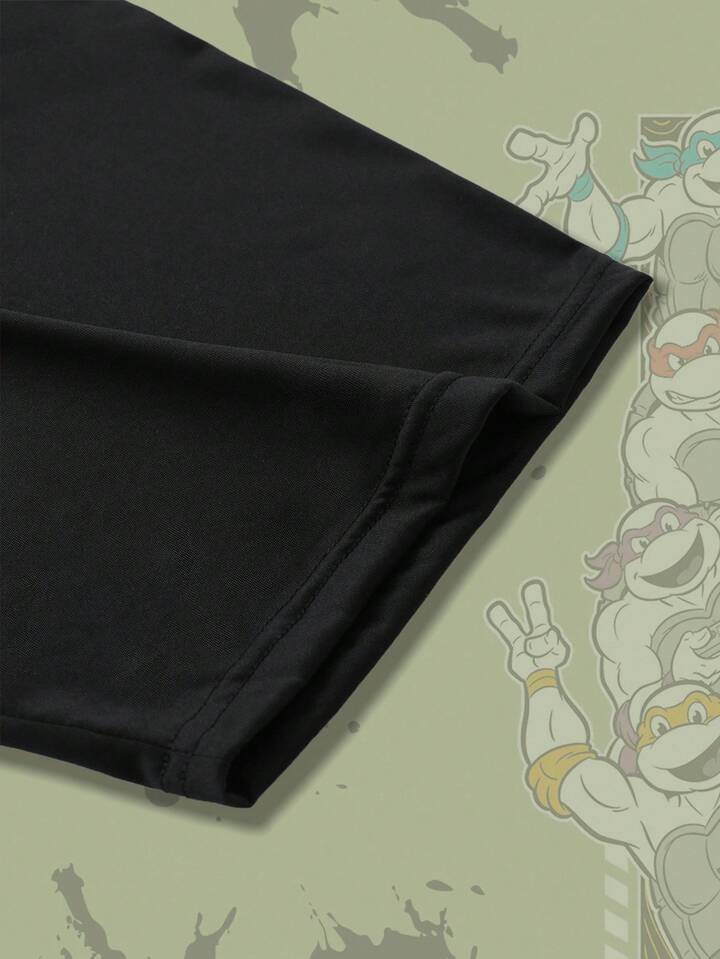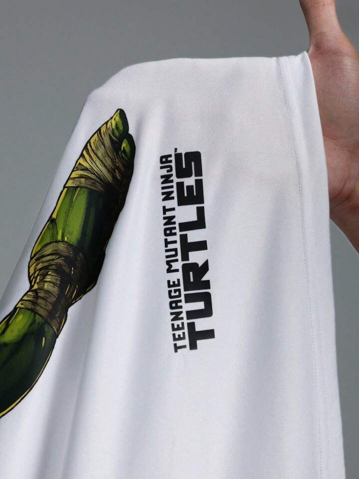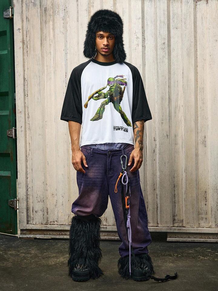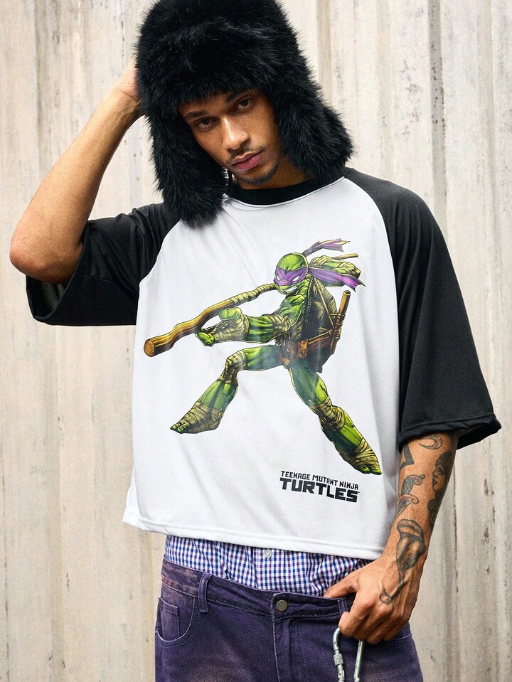 TEENAGE MUTANT NINJA TURTLES X ROMWE Men's Fashionable Street Cartoon Turtle & Slogan Graphic Contrast Raglan Sleeve Loose T-Shirt, Summer