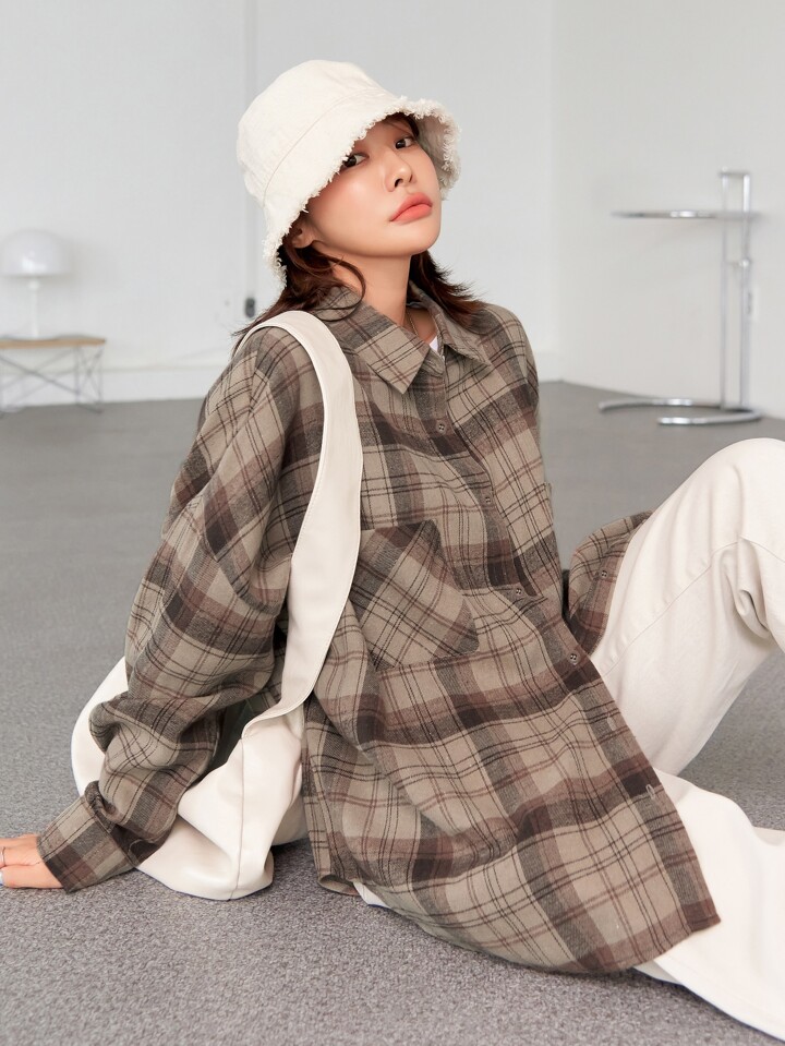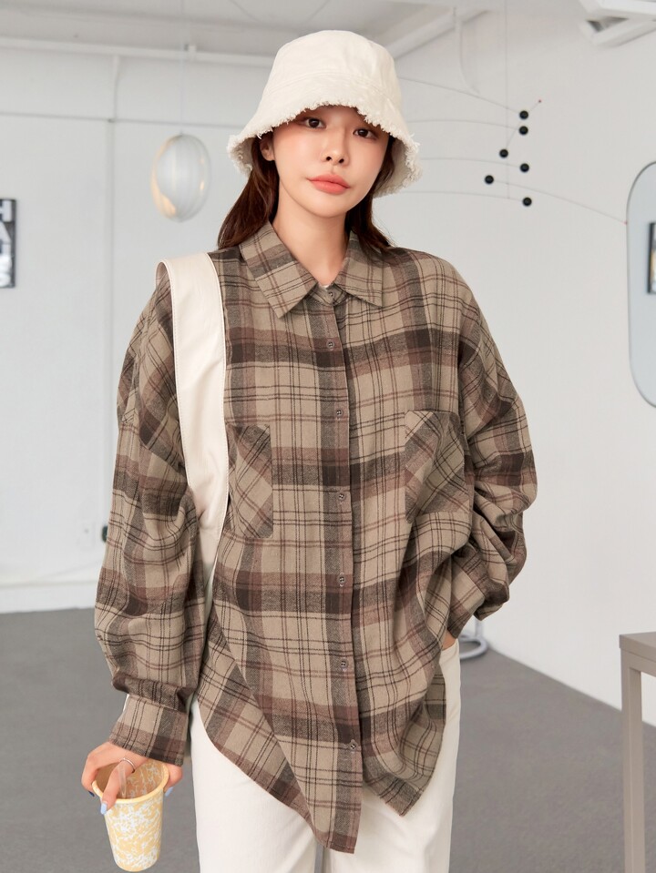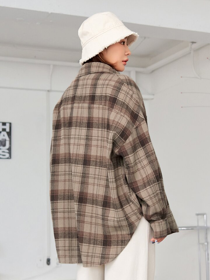 Tartan Pocket Front Drop Shoulder Blouse,Long Sleeve Tops,Fall Clothes