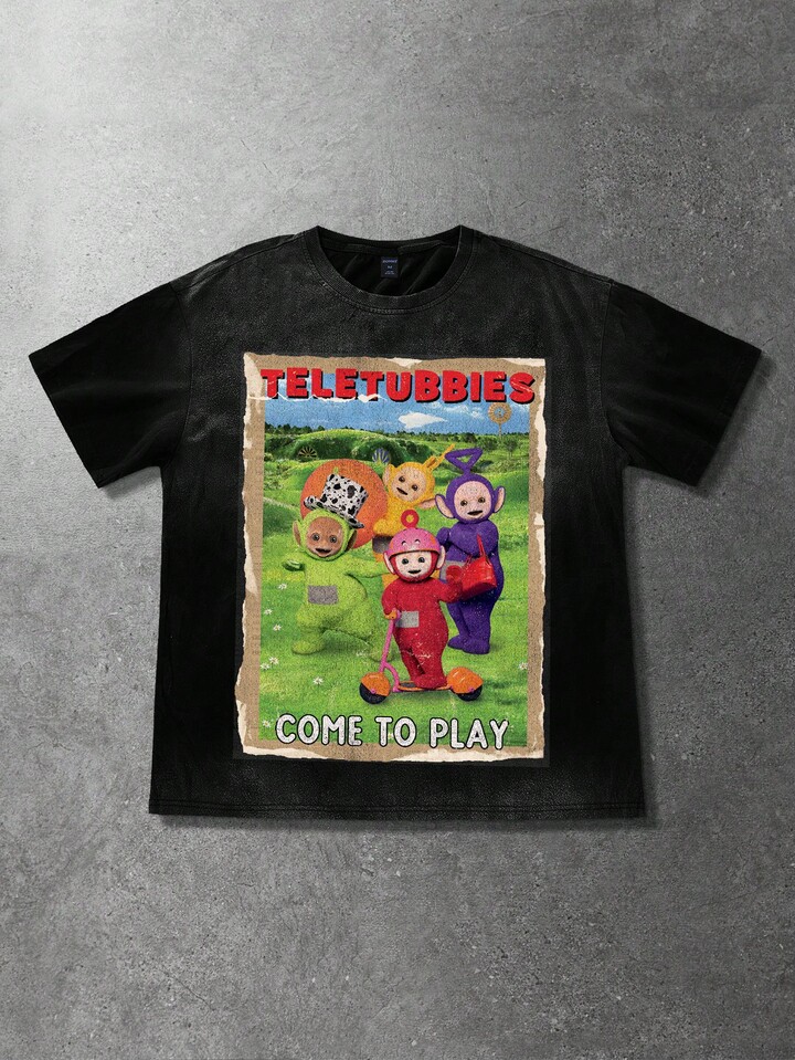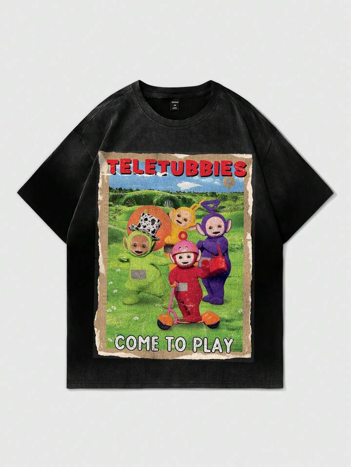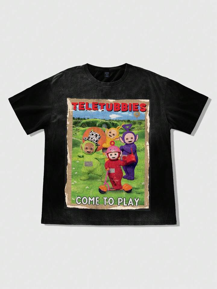 Teletubbies X ROMWE Men's Casual Cute Cartoon Pattern Round Neck Short Sleeve T-Shirt, Summer