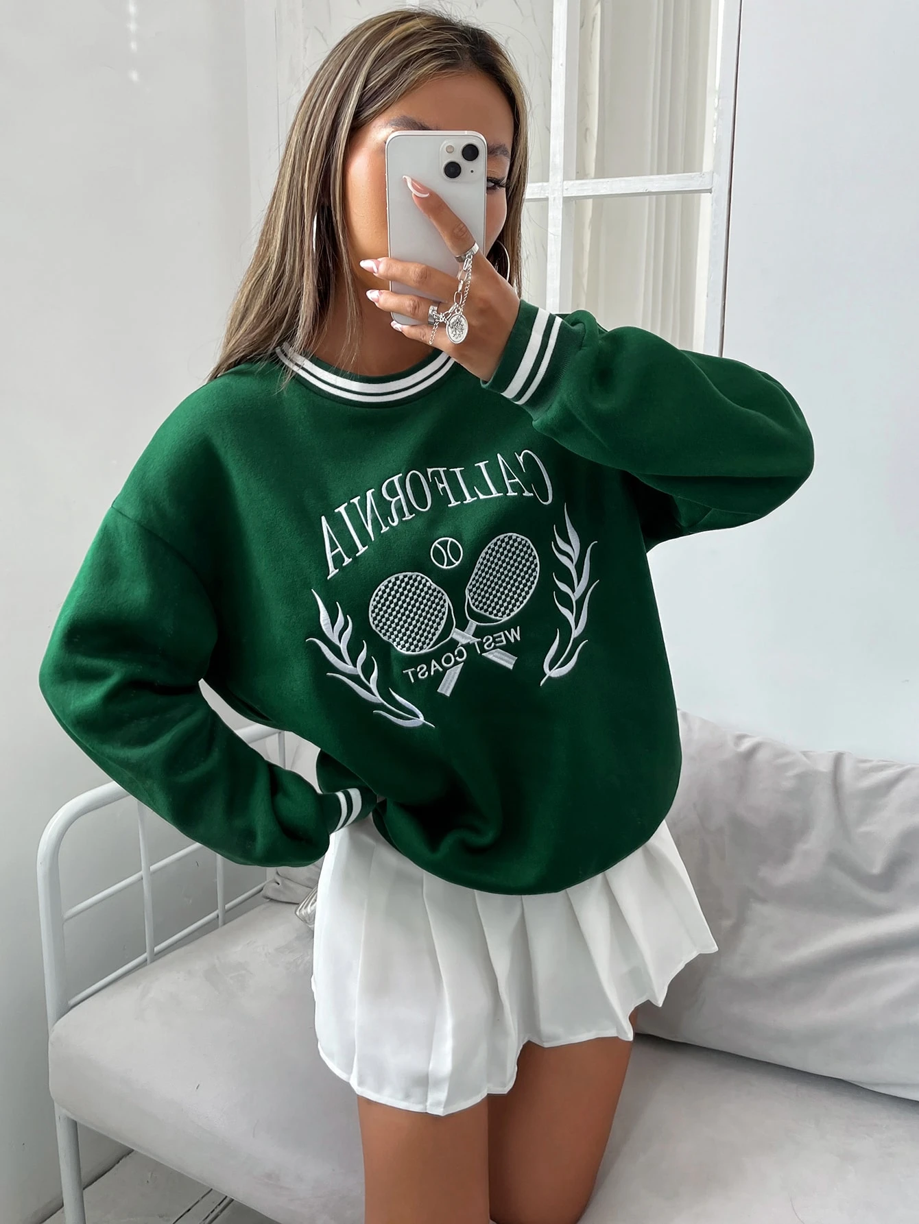 Tennis Racket And Letter Embroidery Striped Trim Sweatshirt