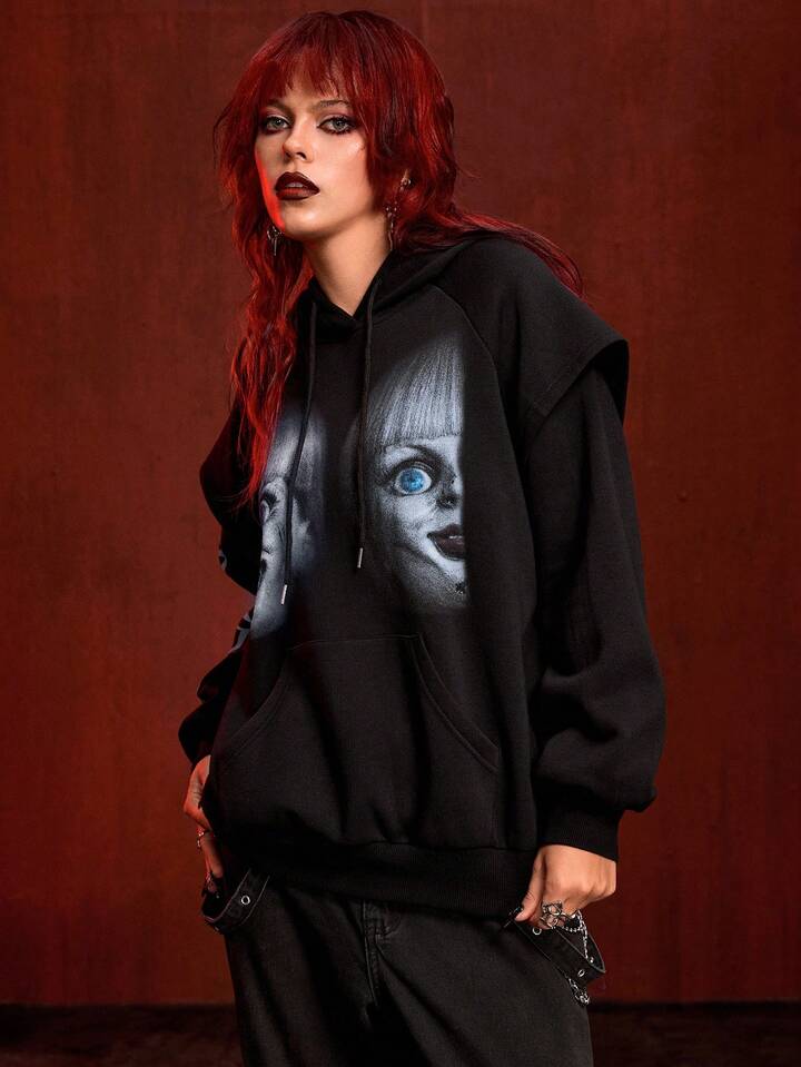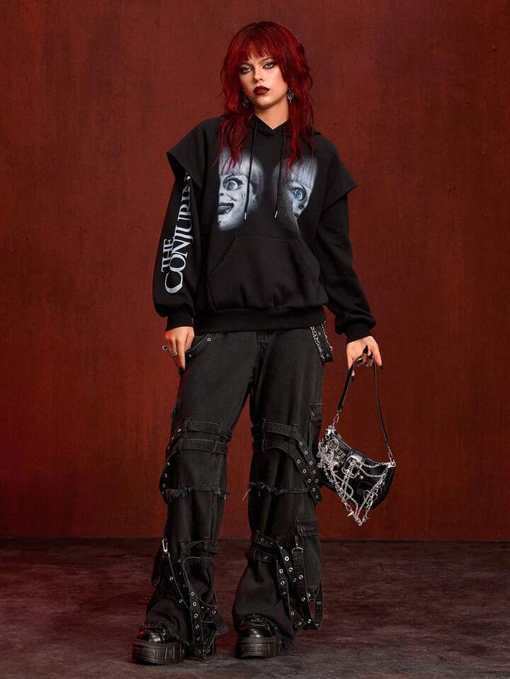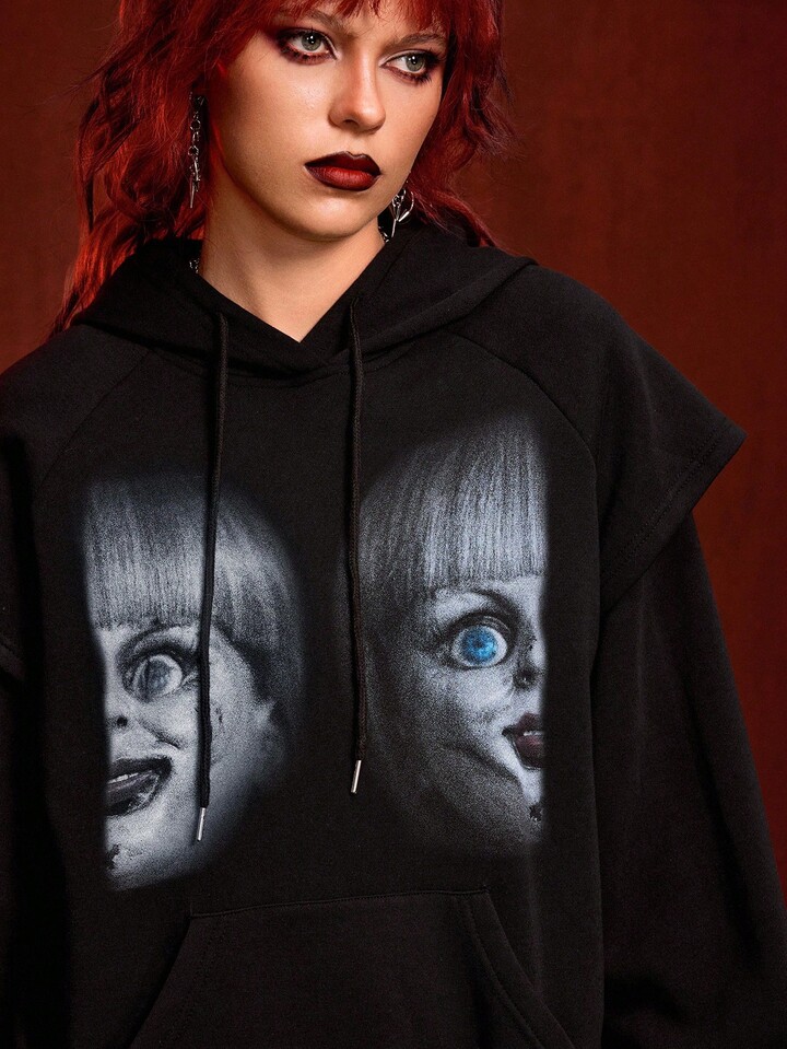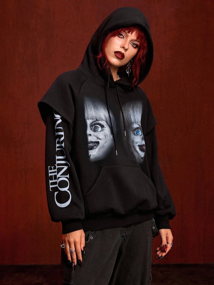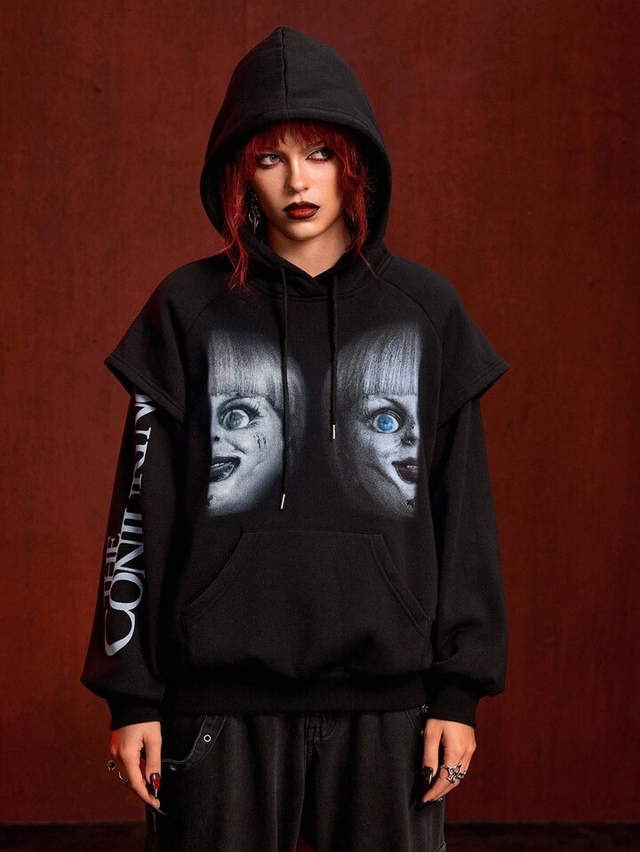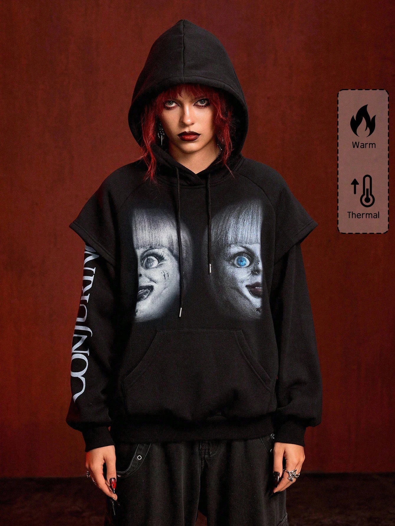 The Conjuring X ROMWE Women's Casual Dark Figure Graphic & Letter Graphic Drawstring Hooded 2-In-1 Sweatshirt, Spring/Autumn