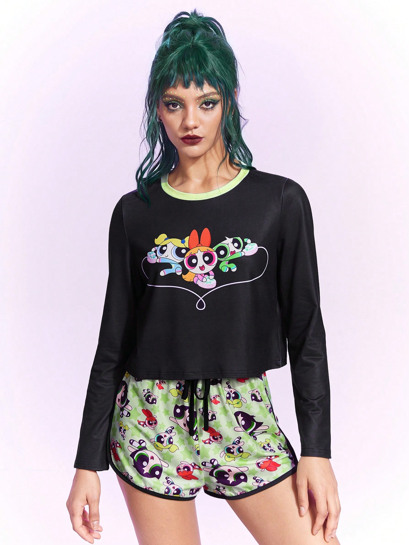 The Powerpuff Girls | ROMWE Cartoon Graphic Contrast Binding PJ Set
