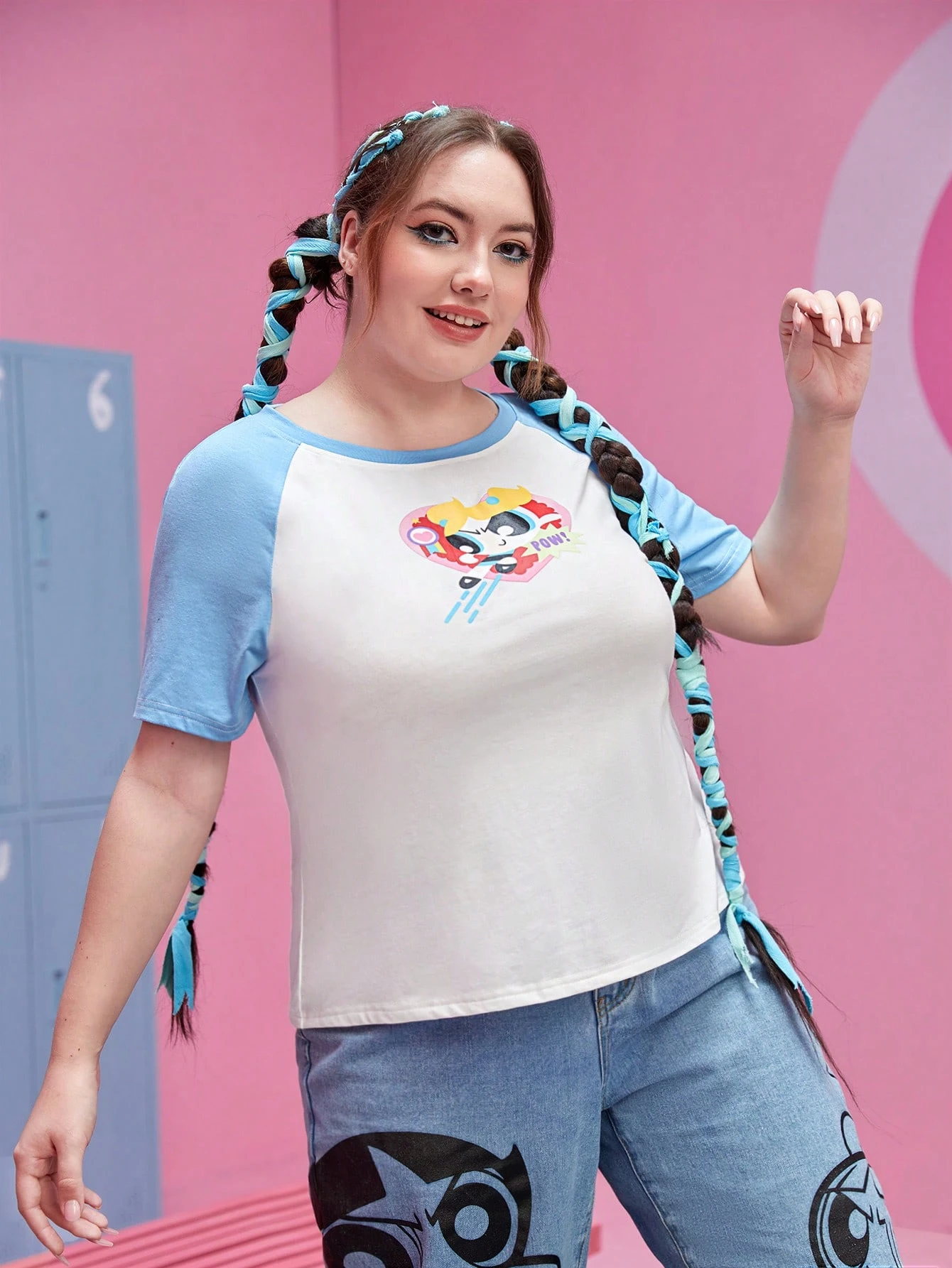 The Powerpuff Girls | ROMWE Plus Cartoon Graphic Raglan Sleeve Tee