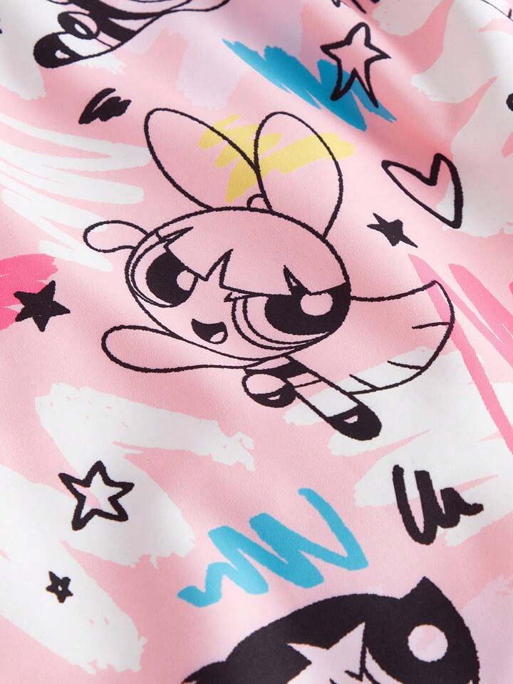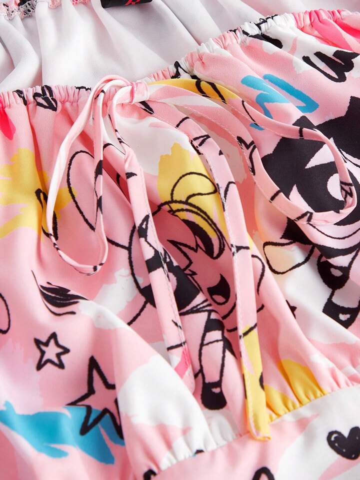 The Powerpuff Girls | ROMWE Plus Cartoon Graphic Tie Front Ruffle Hem Dress