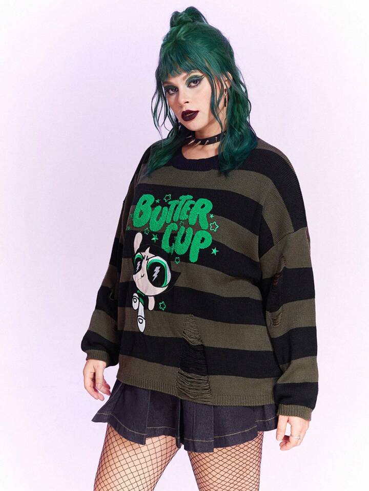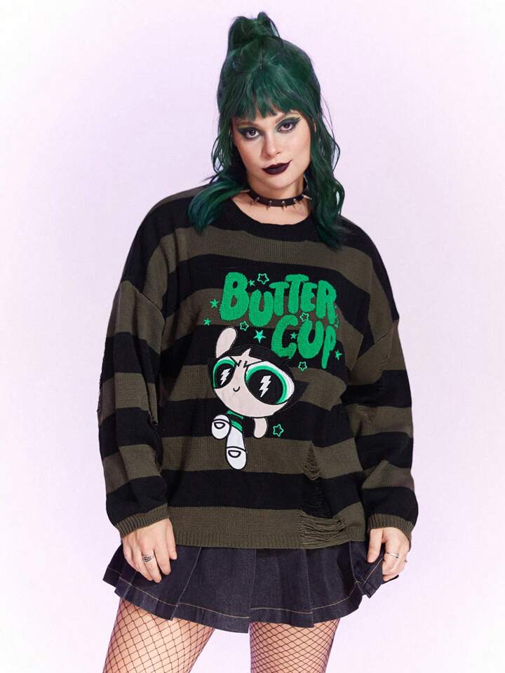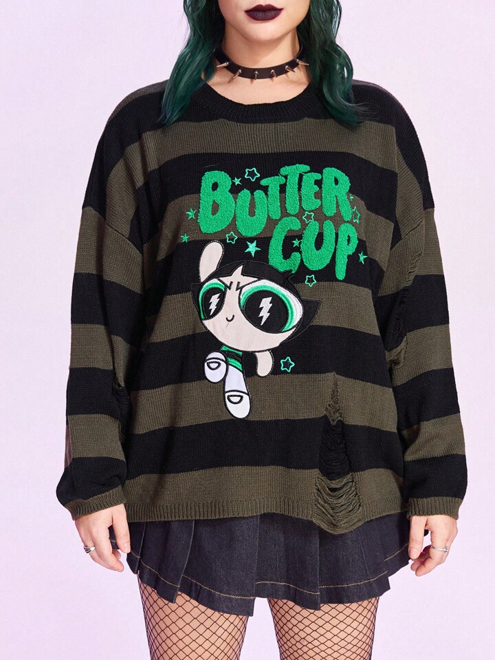 The Powerpuff Girls | ROMWE Plus Striped Cartoon & Letter Pattern Ripped Drop Shoulder Sweater
