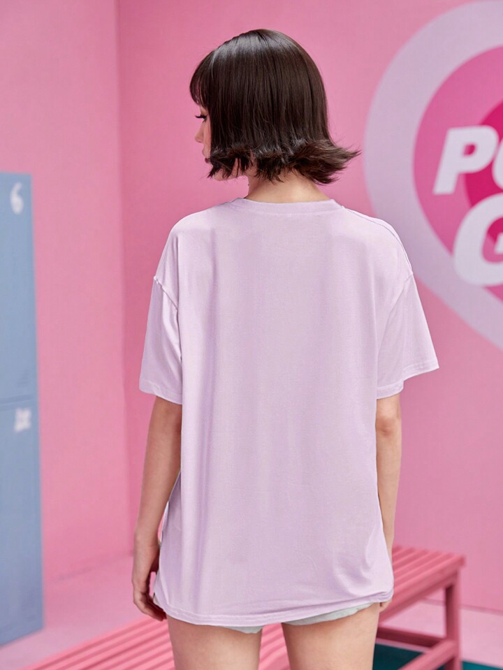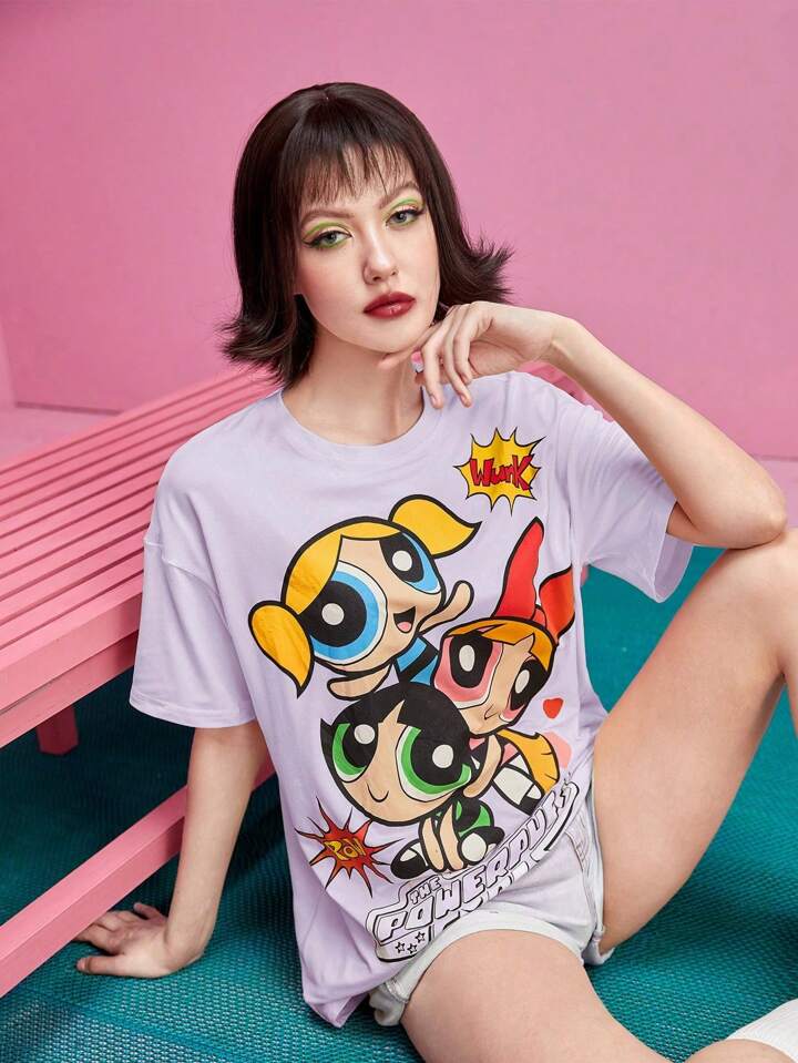 The Powerpuff Girls | ROMWE Women's Casual Cartoon & Letter Print Drop Shoulder Oversized T-Shirt, Summer