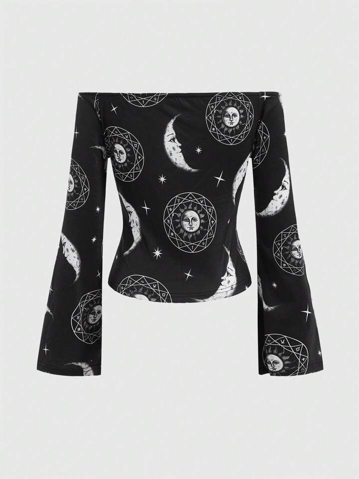 ThisUniqueVibe Off Shoulder Moon Print Flare Sleeve T-shirt