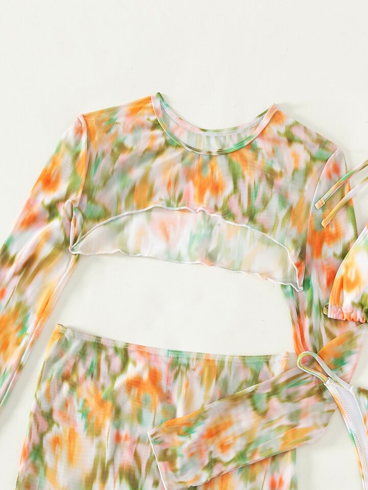 Tie Dye Print Bikini Set Halter Micro Triangle Bra & Bikini & Super Crop Cover Up Top 3 Piece Swimwear