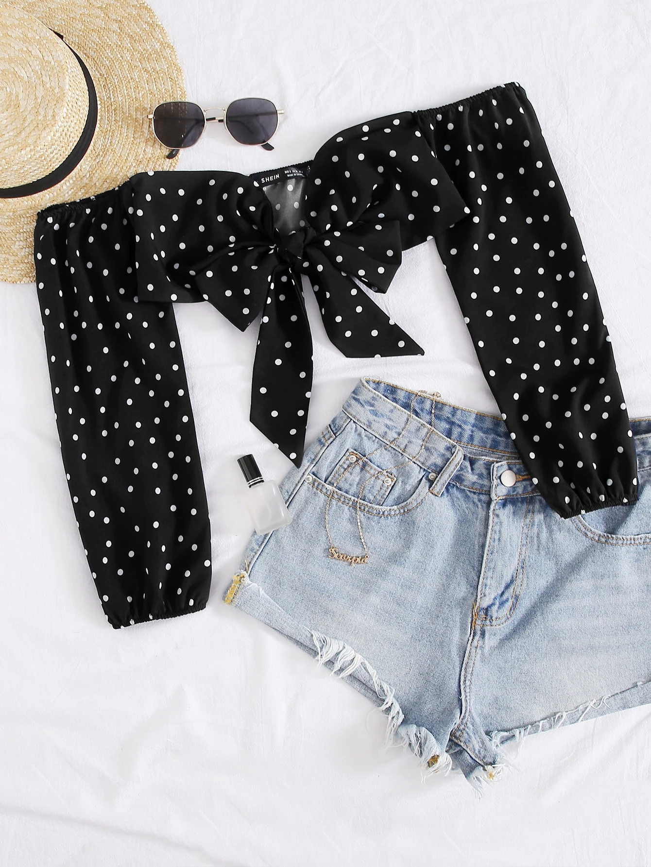 Tie Front Polka-dot Print Bardot Top