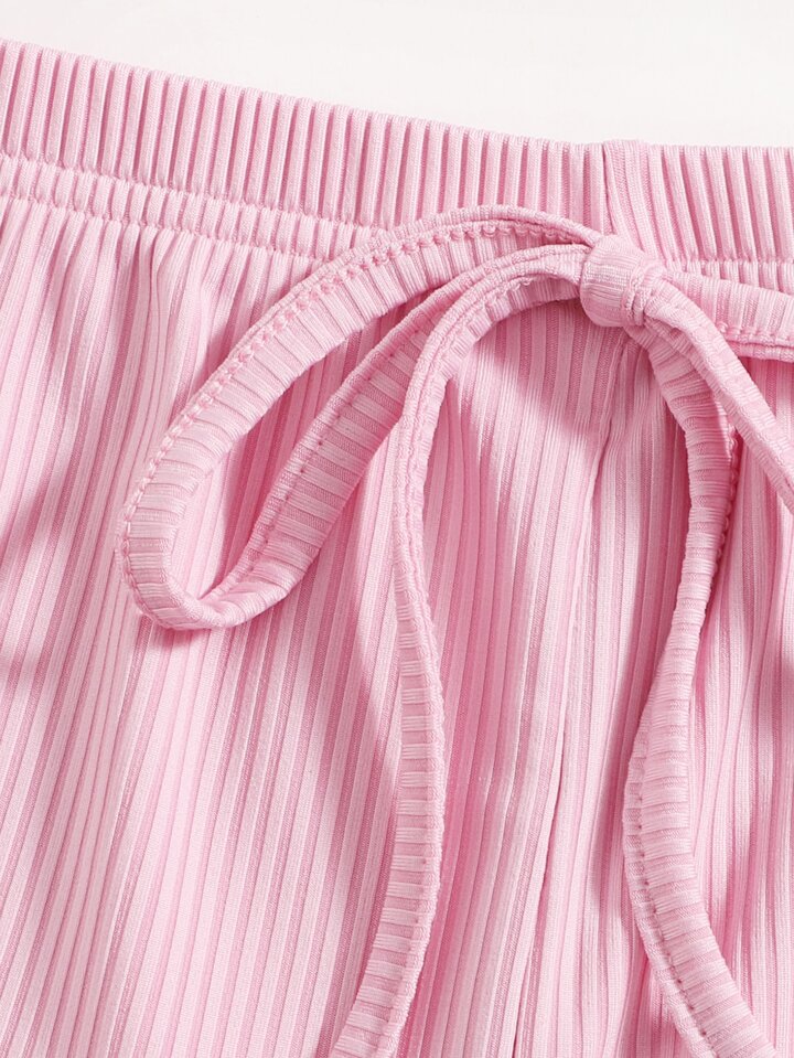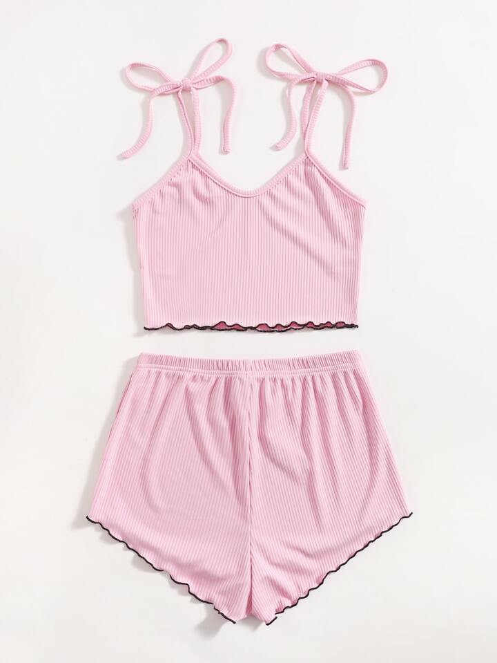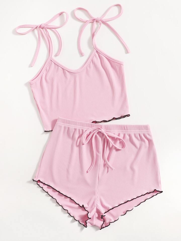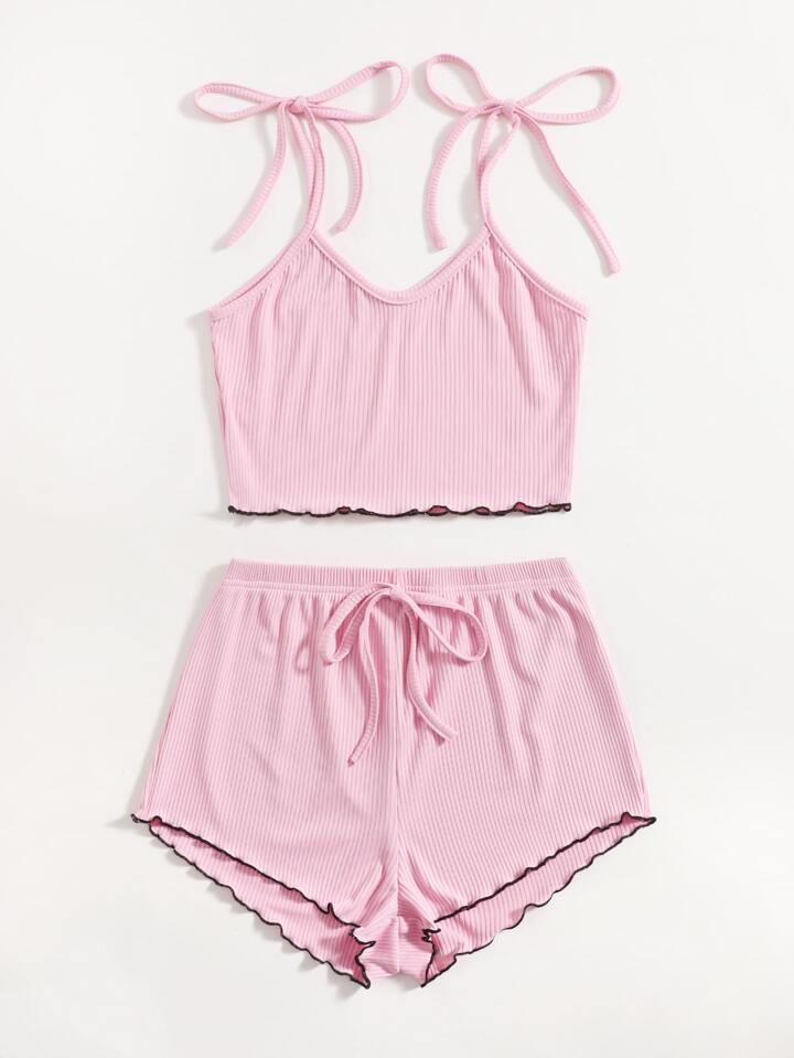 Tie Shoulder Ribbed Lettuce Trim Lounge Set