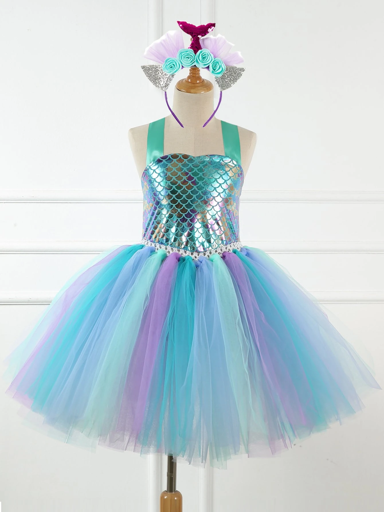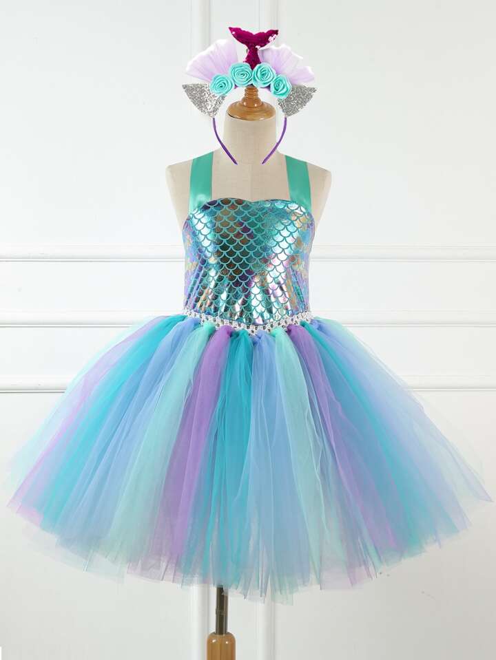 Toddler Girls Fish Scales Backless Halter Gown Dress & Headband