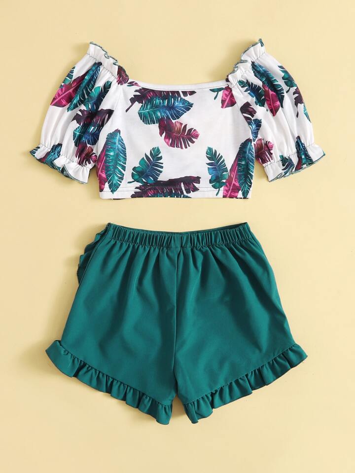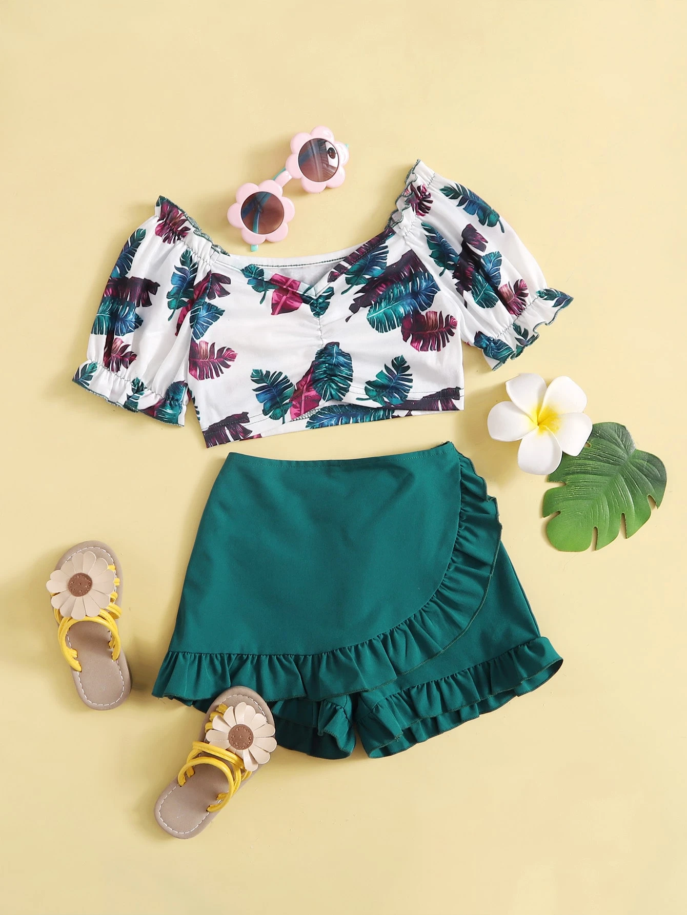 Toddler Girls Tropical Print Flounce Sleeve Crop Blouse With Skort