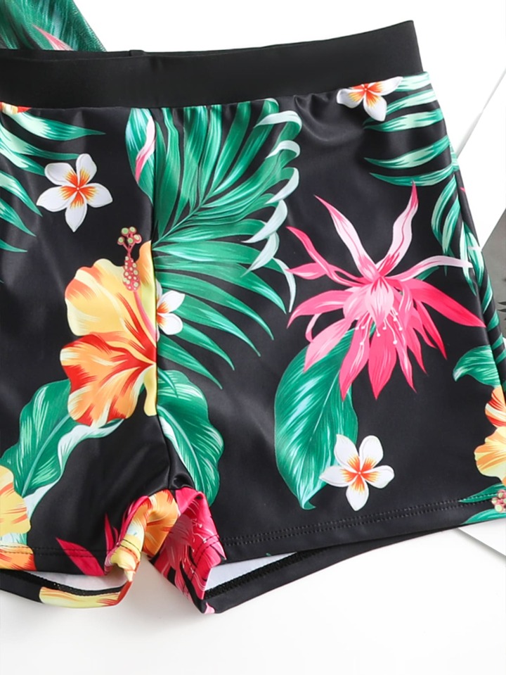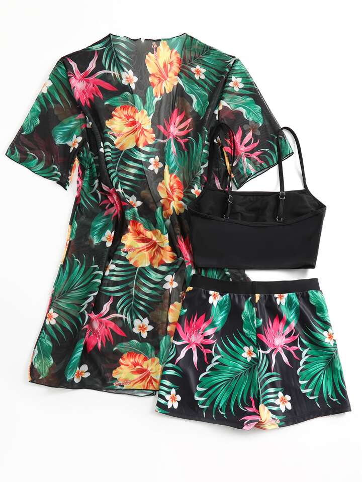 Tropical Print Bikini Set Wireless Cami Top & Boxer Shorts & Open Front Kimono 3 Piece Swimwear,Summer Beach