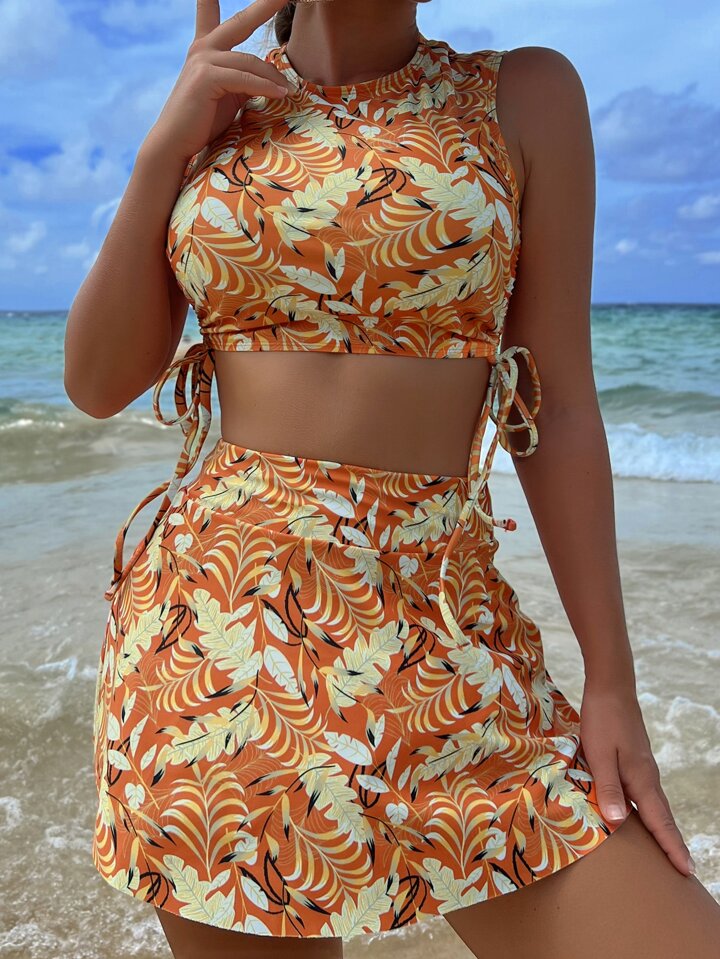 Tropical Print Drawstring Side Bikini Set With Beach Skirt Summer Beach
