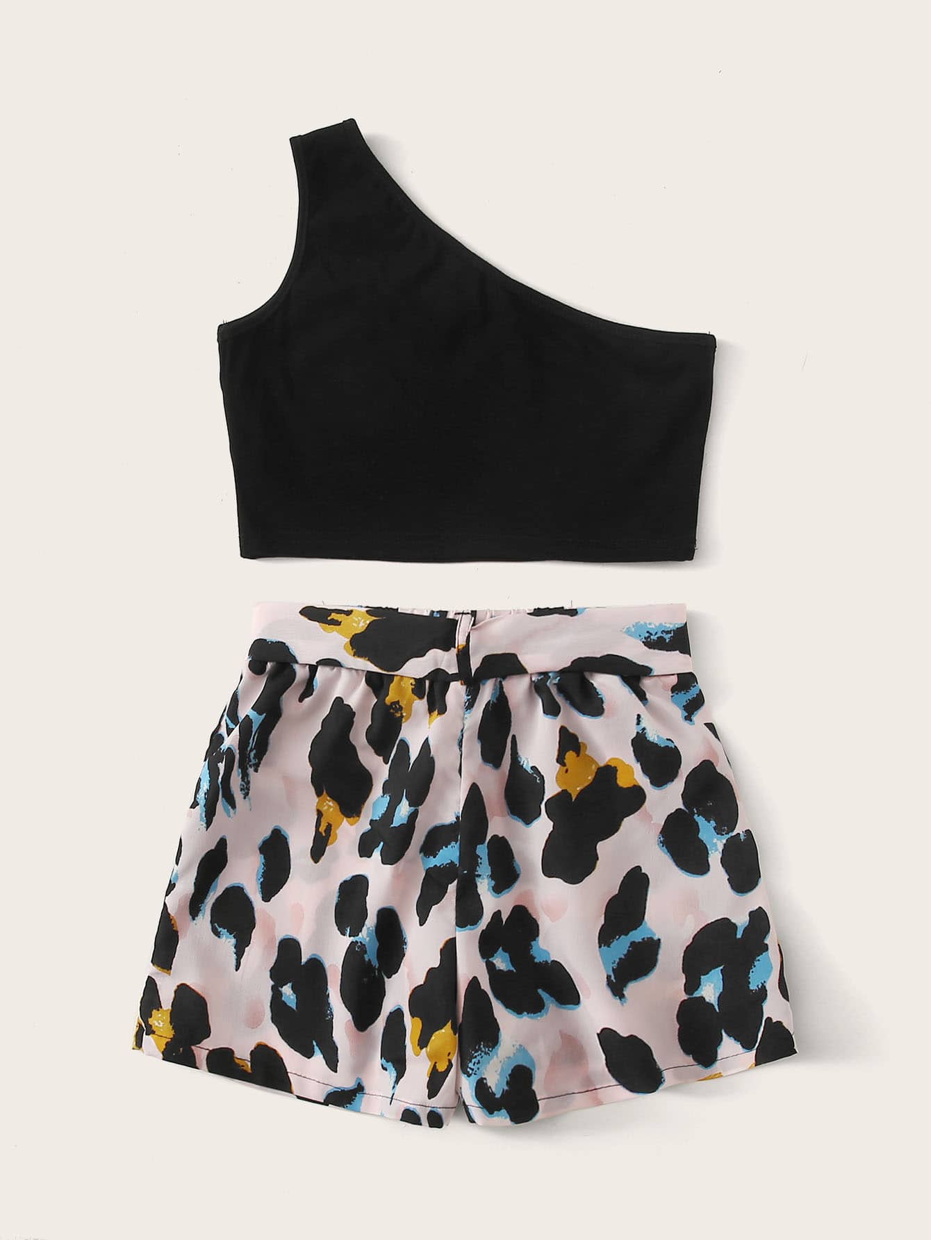 Tween Girl One Shoulder Top & Belted Allover Print Shorts Set