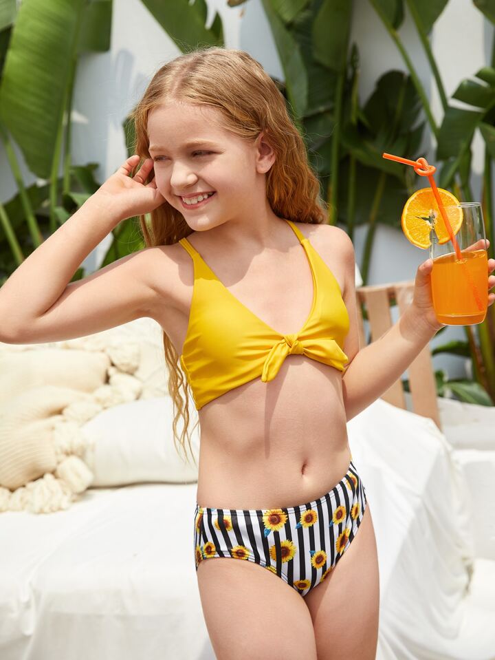 Tween Girl Sunflower & Striped Knot Front Bikini Set Summer Beach