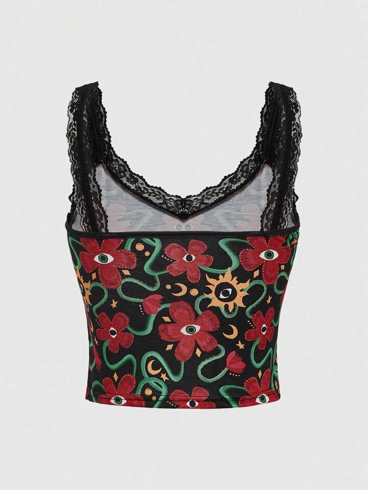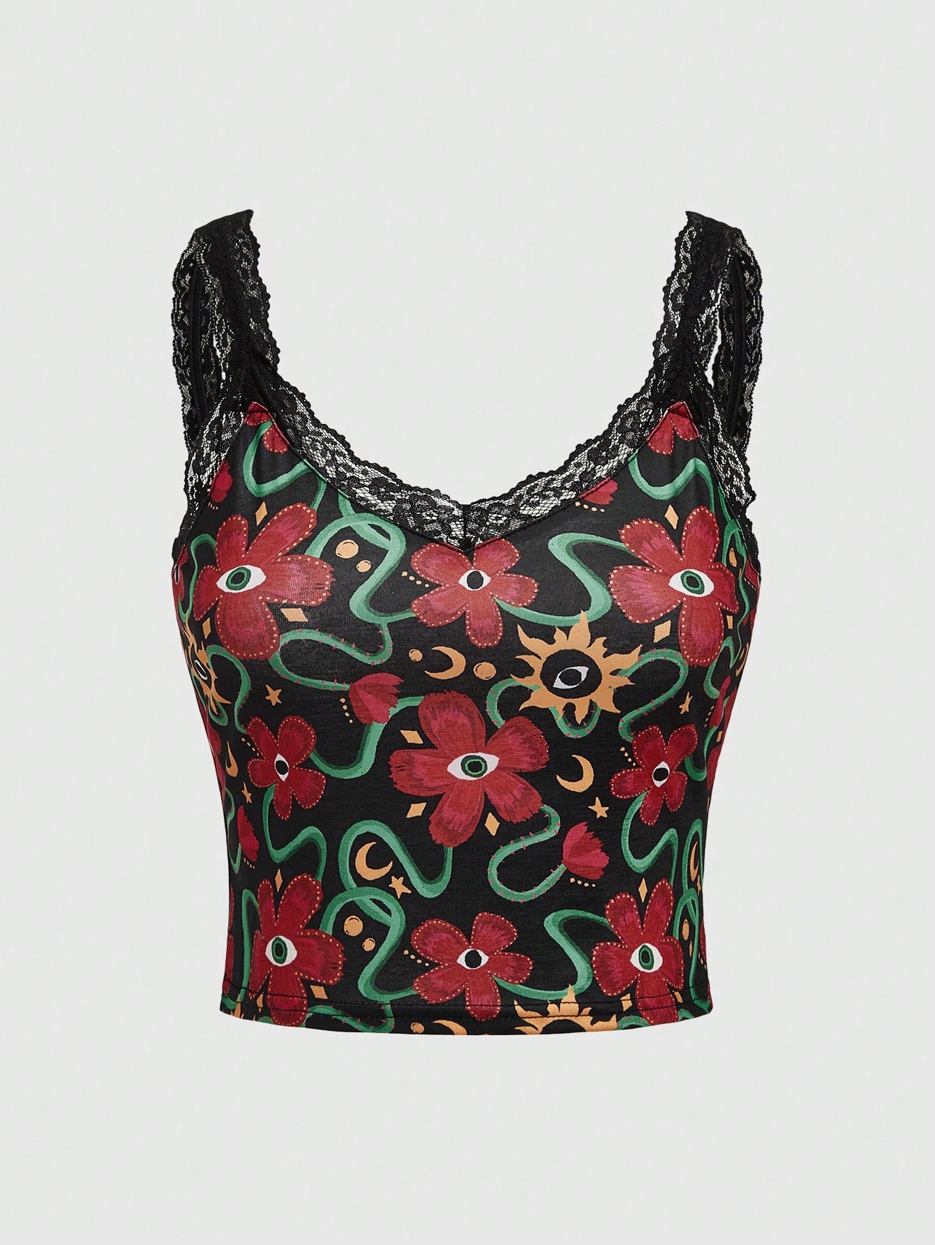 Umamao Estudio Flower & Eye Pattern Printed Lace Splicing Cami Top