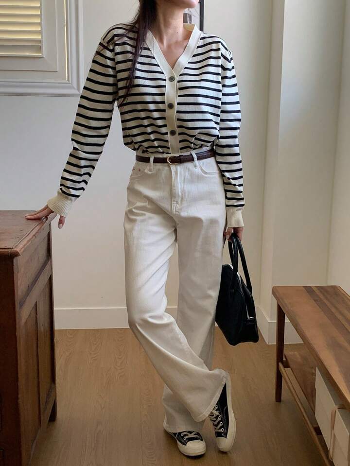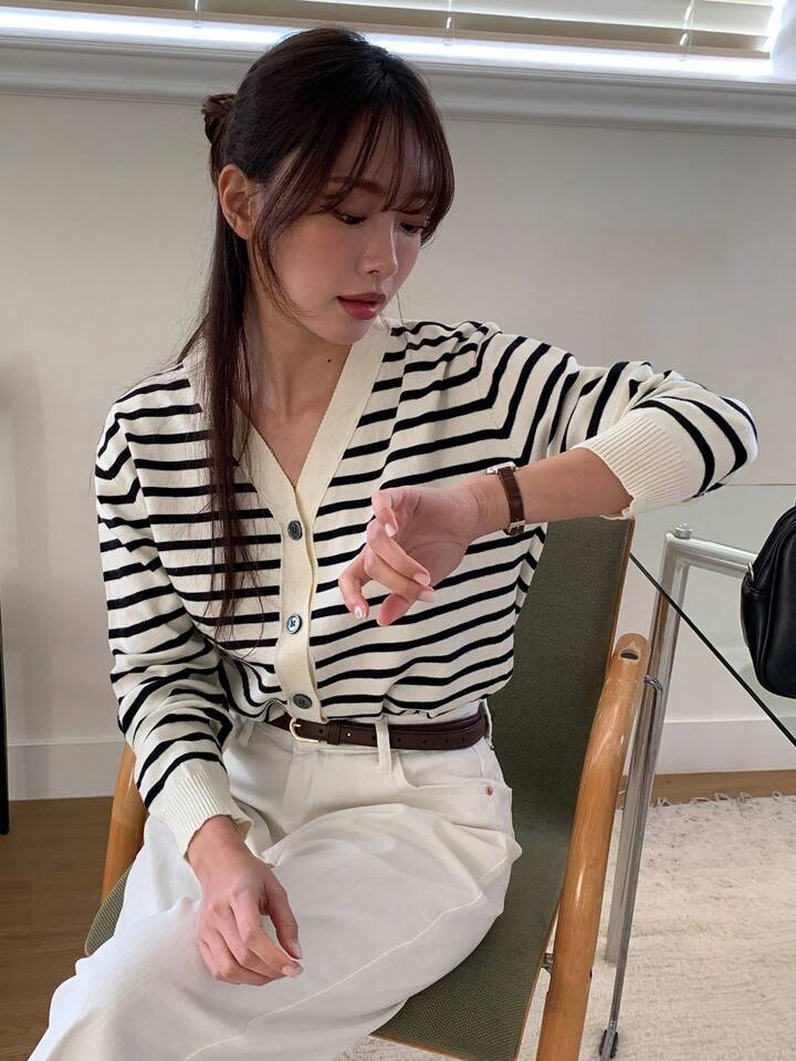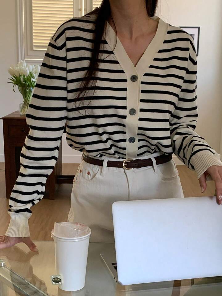 V-Neck Striped Knit Cardigan For Women, Loose Fit,Fall Clothes