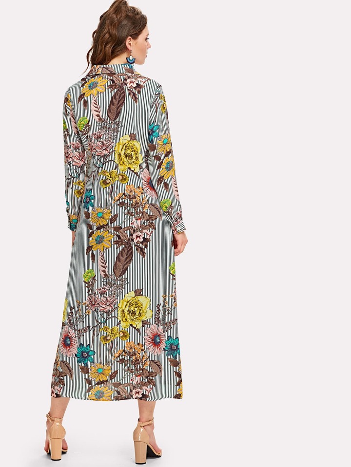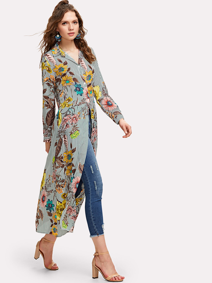 Vertical Striped Florals Longline Shirt