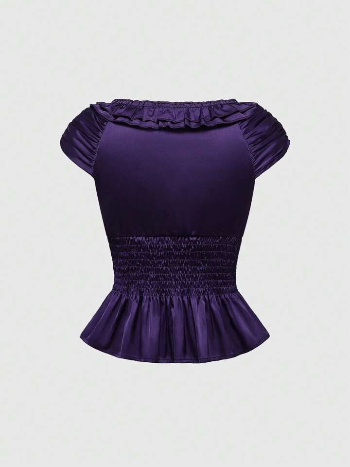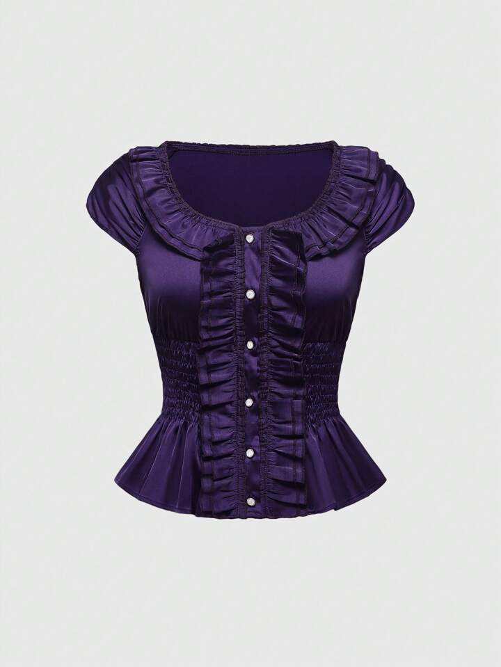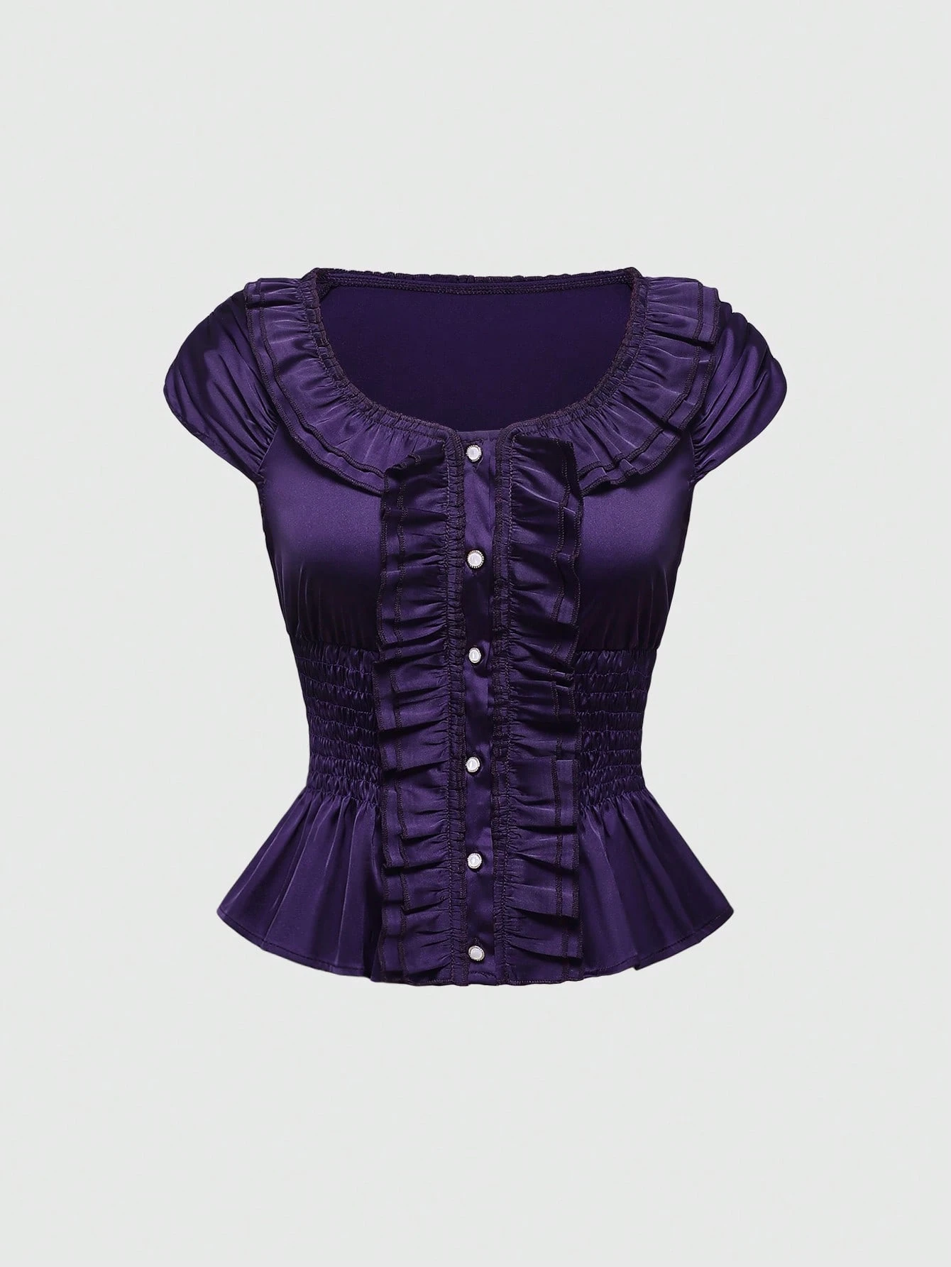 Vintage Elegant Satin Ruffle Trim Fitted Women Shirt
