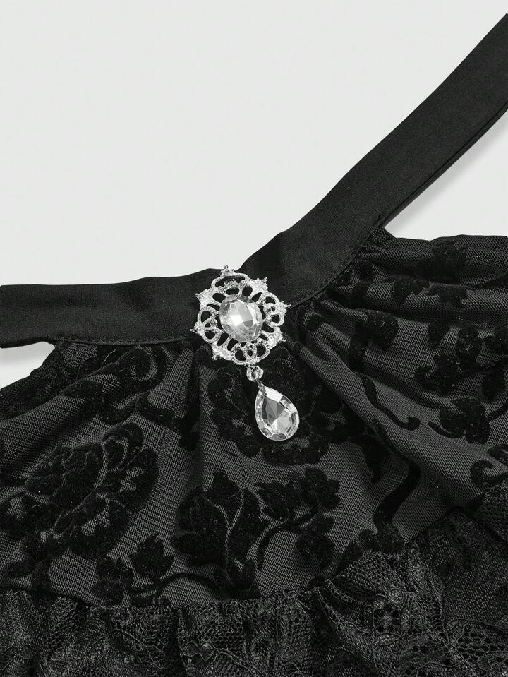 Vintage Palace Style Gothic Flocked Detachable Ruffle Tie Collar, Baroque Diamond Pendant, Bell Ruffle Sleeve, Tie Waist Women Blouse