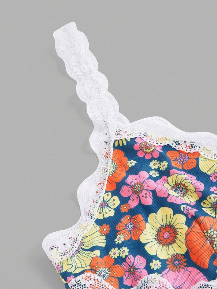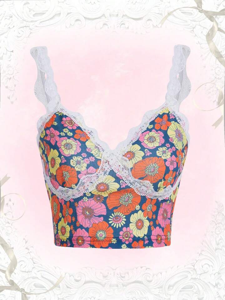 Whitebread Floral Print Lace Trim Cami Top