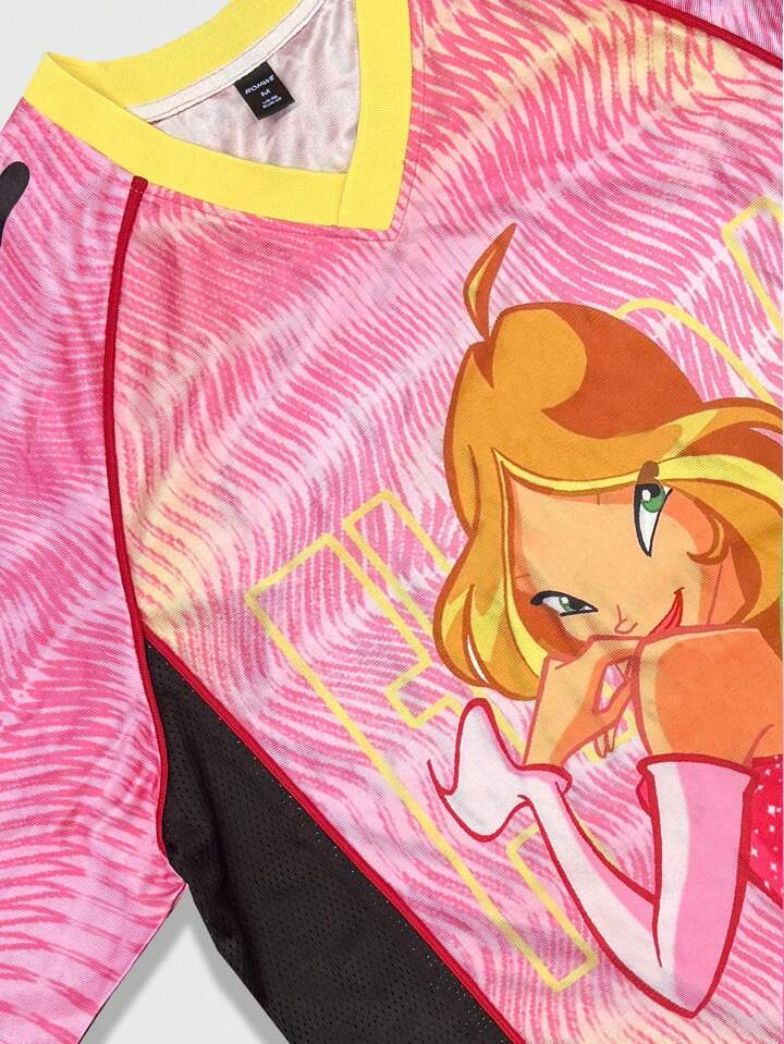 Winx Club X ROMWE Men's Anime Jersey Contrast Color Cartoon Figure Graphic Printed V-Neck Short Sleeve Polo Shirt