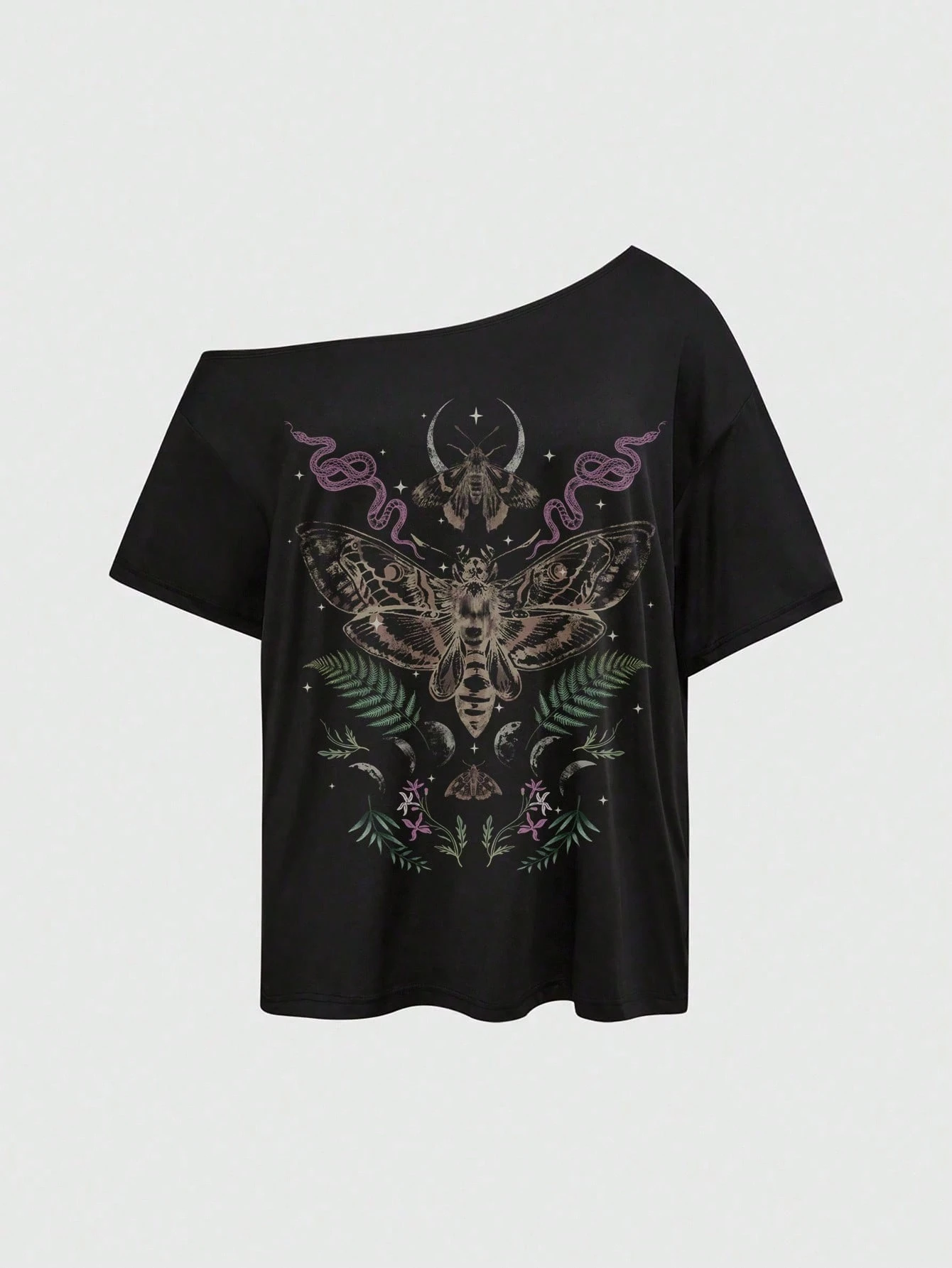 Witch, Gothic Moth Snake Floral Print Mystic Goth Sexy Asymmetrical Shoulder Plain Black Summer Casual Vintage Plus Size Asymmetrical Shoulder T-Shirt Suitable For Going Out