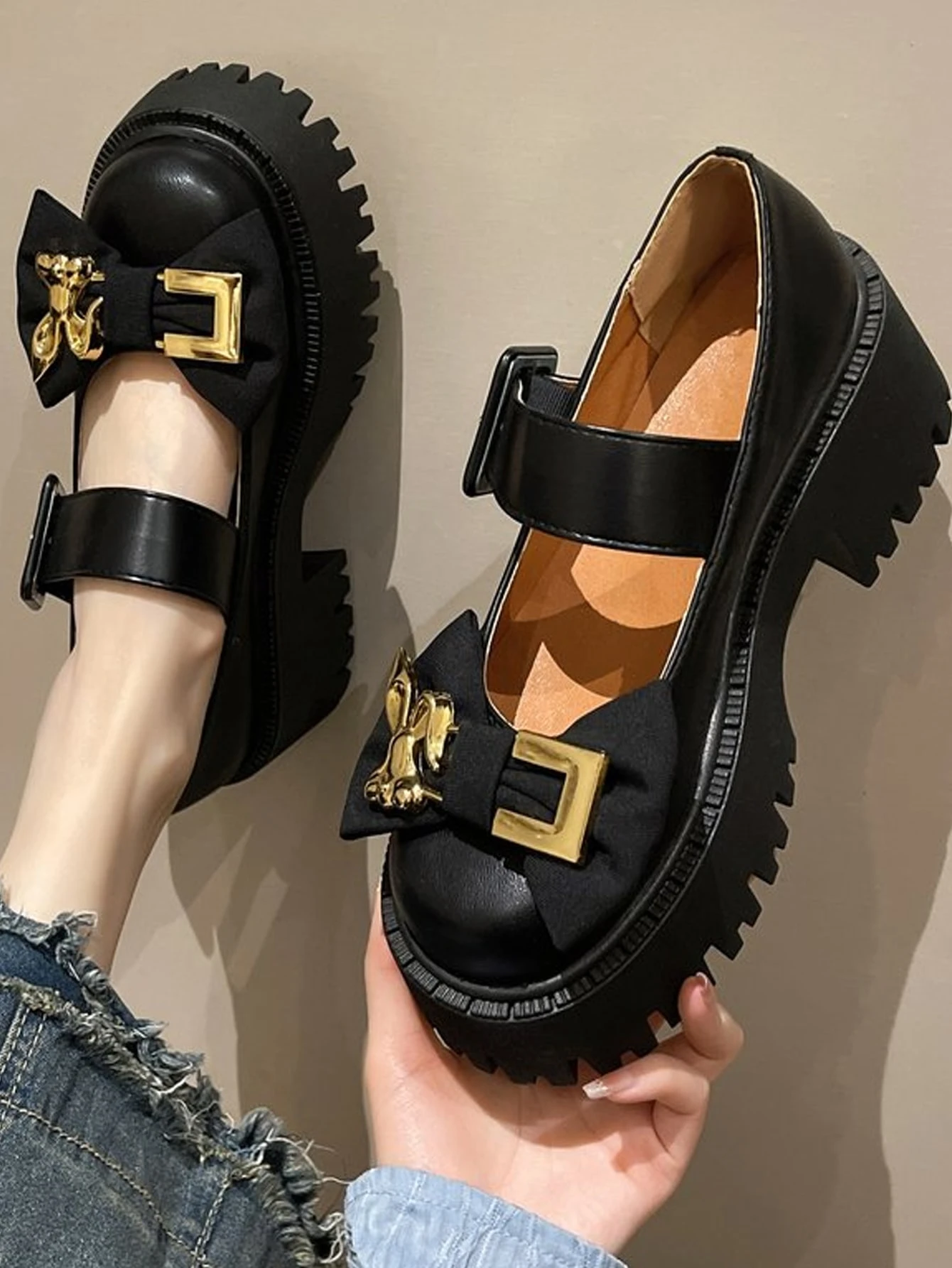Women Bow & Metal Decor Flatform Flats, Preppy Outdoor Mary Jane Flats