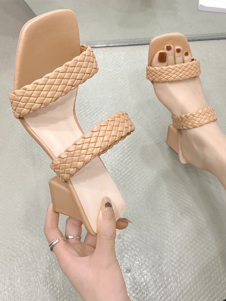 Women Braided Design Double Strap Chunky Heeled Sandals, Vacation Apricot Mule Sandals