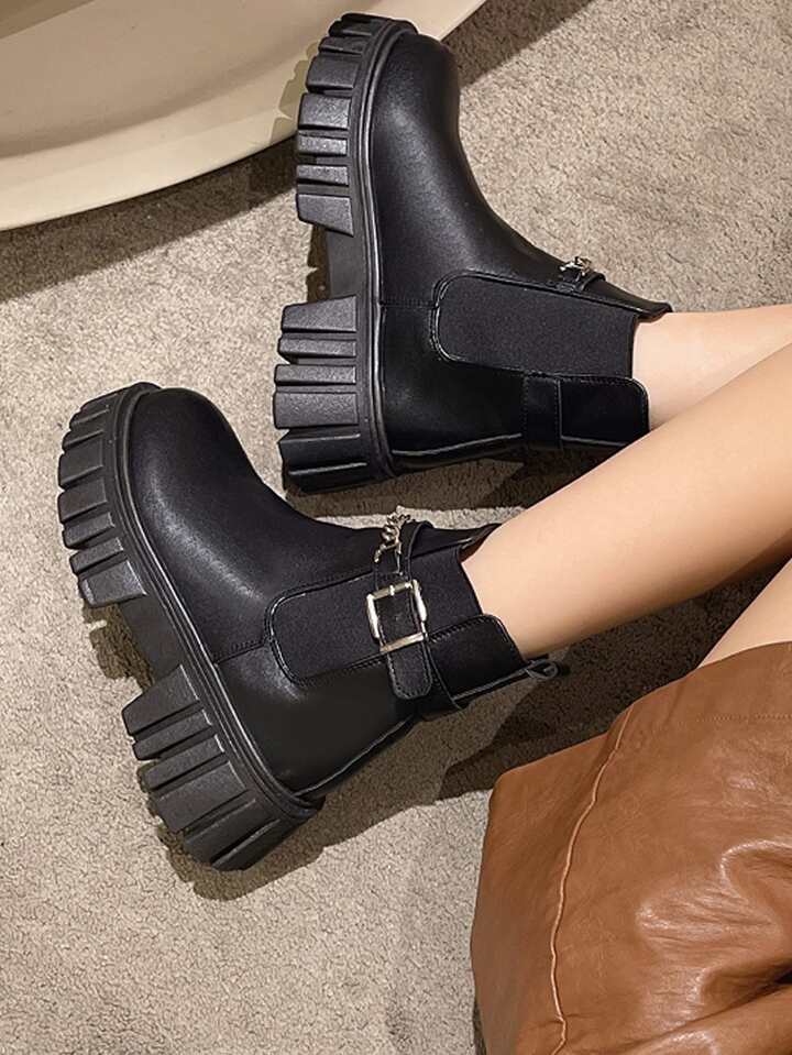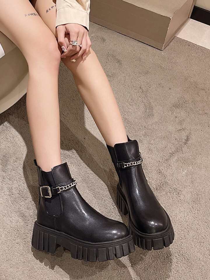 Women Buckle & Chain Decor Slip-On Chelsea Boots, Punk Black Fashion Boots