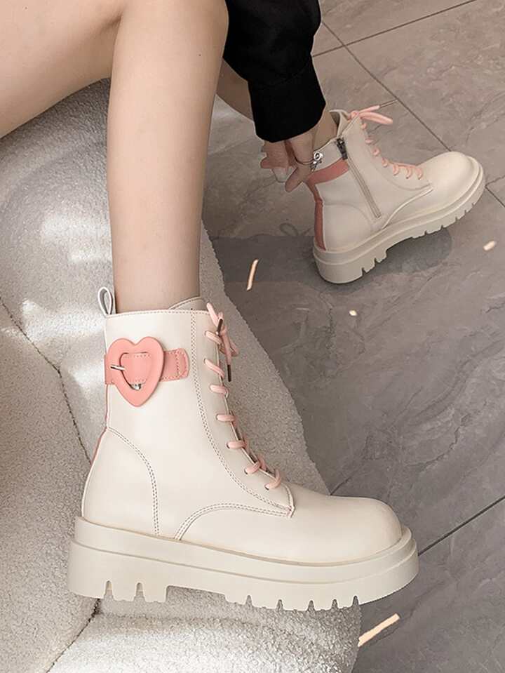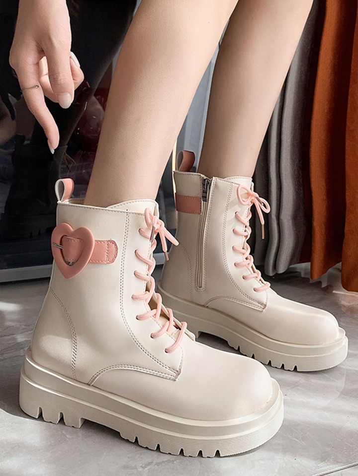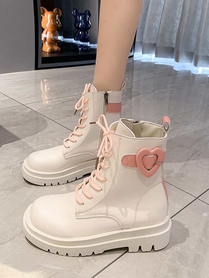 Women Buckle Decor Lace-up Front Fashion Boots, Preppy Beige Combat Boots
