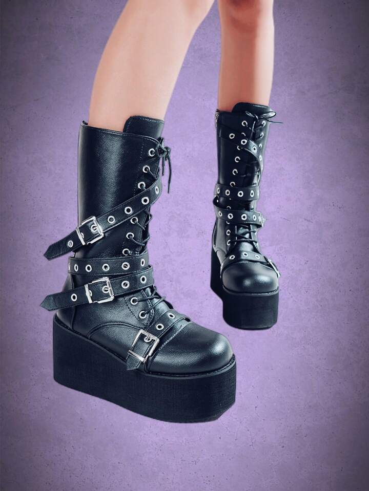 Women Buckle Decor Lace-up Front Flatform Combat Boots, Punk Outdoor Boots