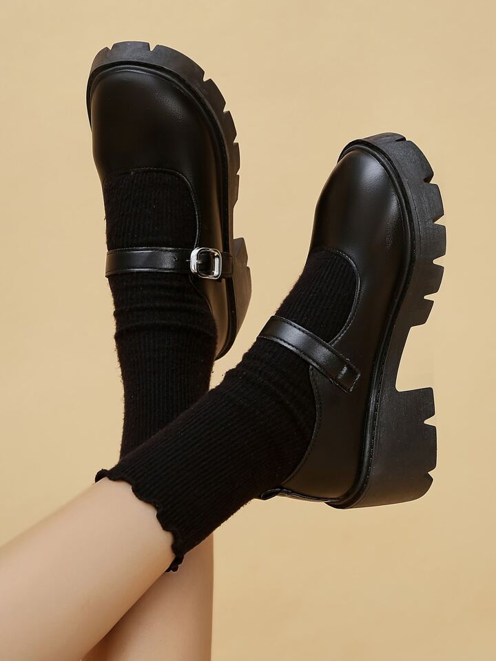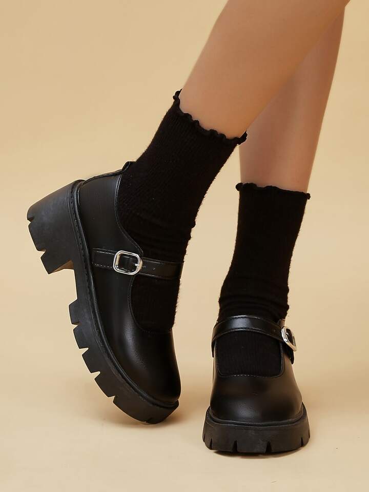 Women Buckle Decor Platform Preppy Black Mary Jane Shoes