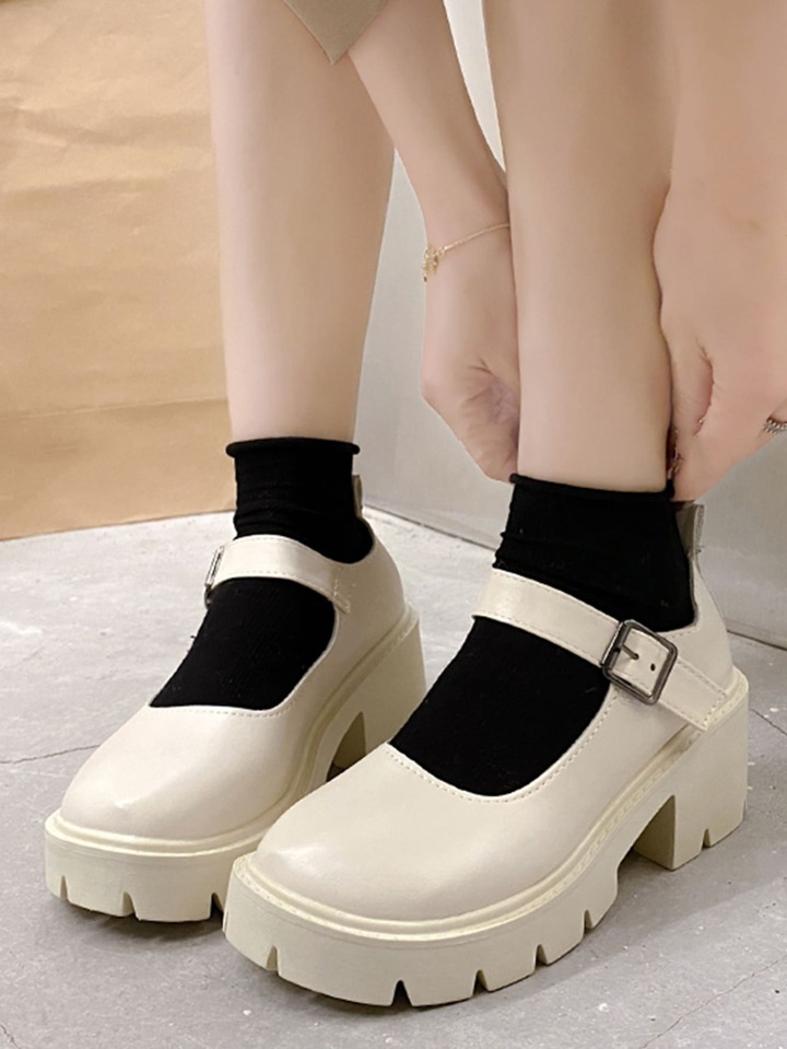 Women Buckle Decor Round Shoes, Preppy Beige Mary Jane Shoes
