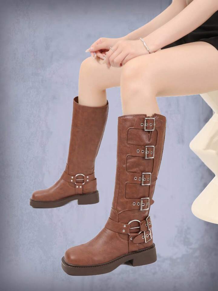 Women Buckle Decor Side Zip Fashion Boots, Fashion Brown Riding Boots