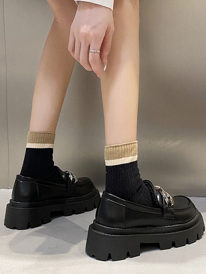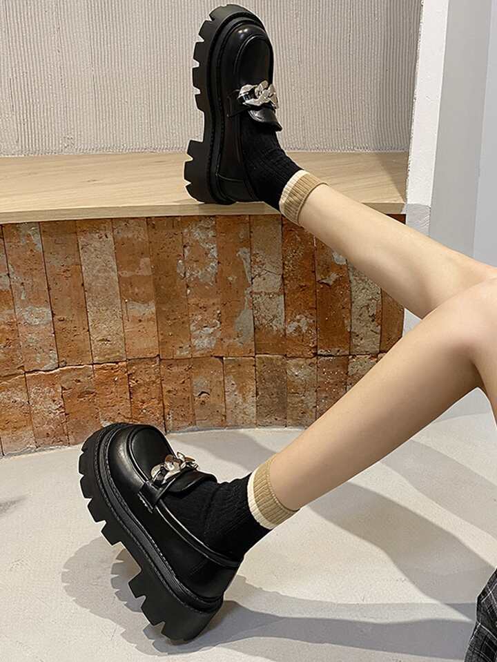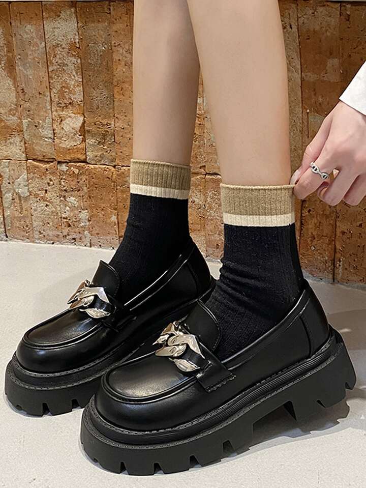 Women Chain Decor Loafers, Artificial Leather Punk Flatform Shoes Black