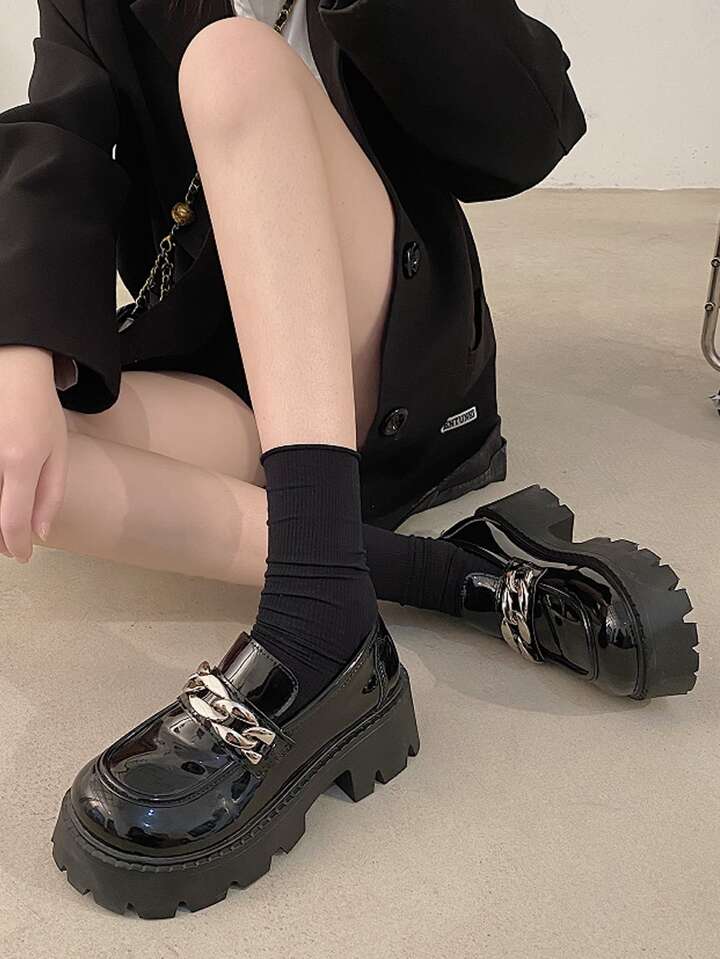 Women Chain Decor Loafers, Artificial Leather Punk Flatform Shoes Black