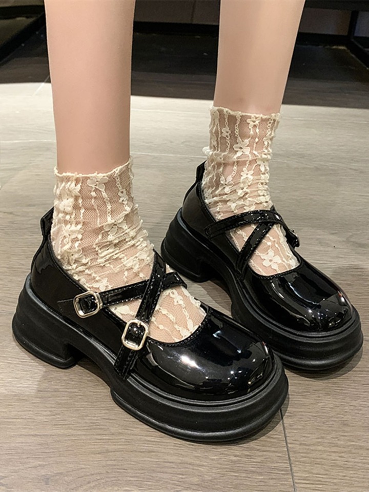 Women Criss Cross Buckle Decor Platform Shoes, Elegant Black Platform Mary Jane Shoes For Outdoor
