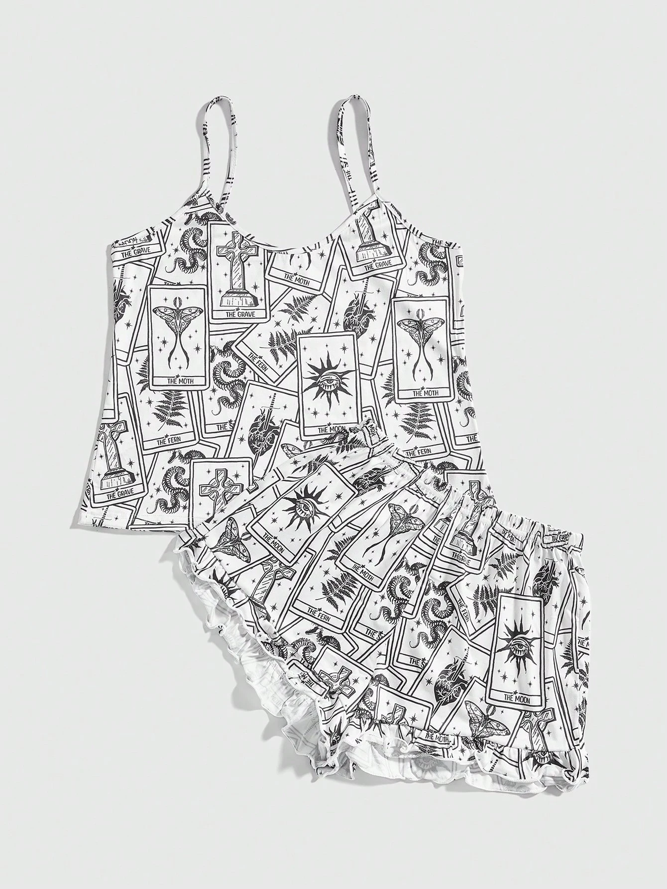 Women Gothic Moth Gravestone Sword Heart Tarot Card Pattern Camisole And Shorts Casual Pajama Set