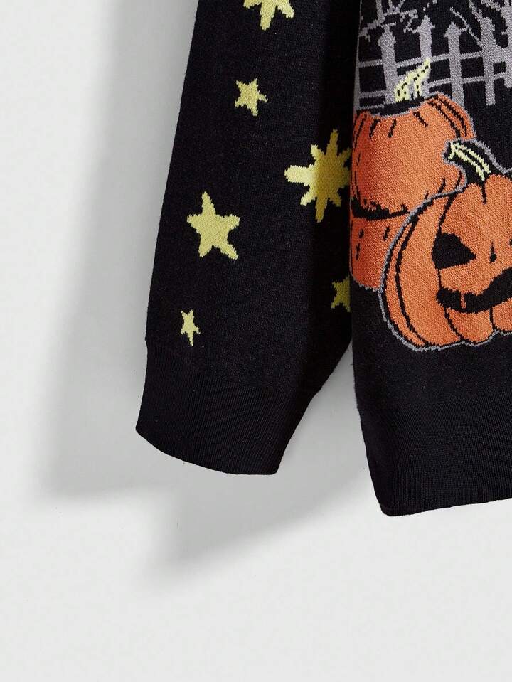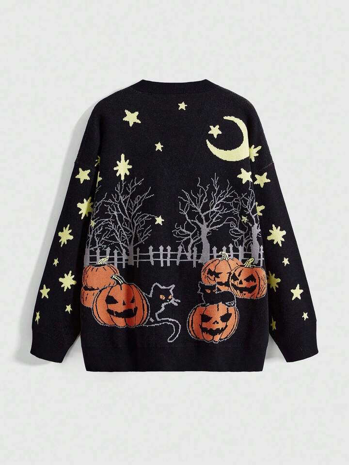 Women Gothic Withered Tree, Moon & Mysterious Cat Pumpkin Halloween Knitted Cardigan