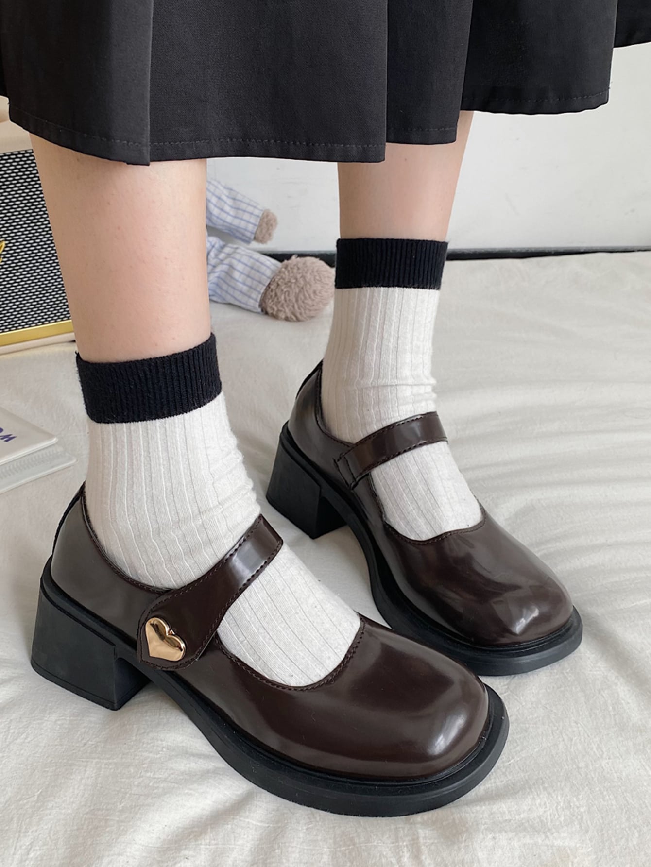 Women Heart Decor Chunky Heeled Mary Jane Pumps, Fashionable Brown Artificial Patent Leather Pumps